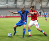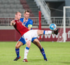 Falleg fyrirgjöf Theodórs Elmars sem Kjartan skallar í netið af stuttu færi.
