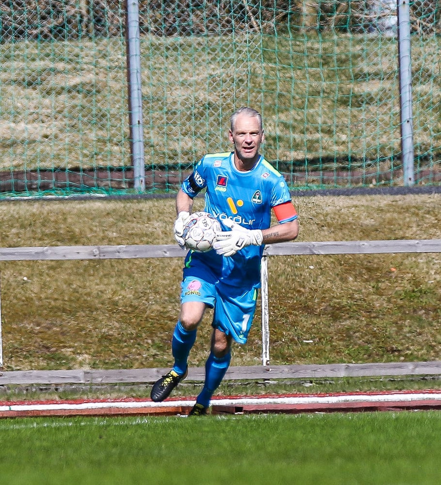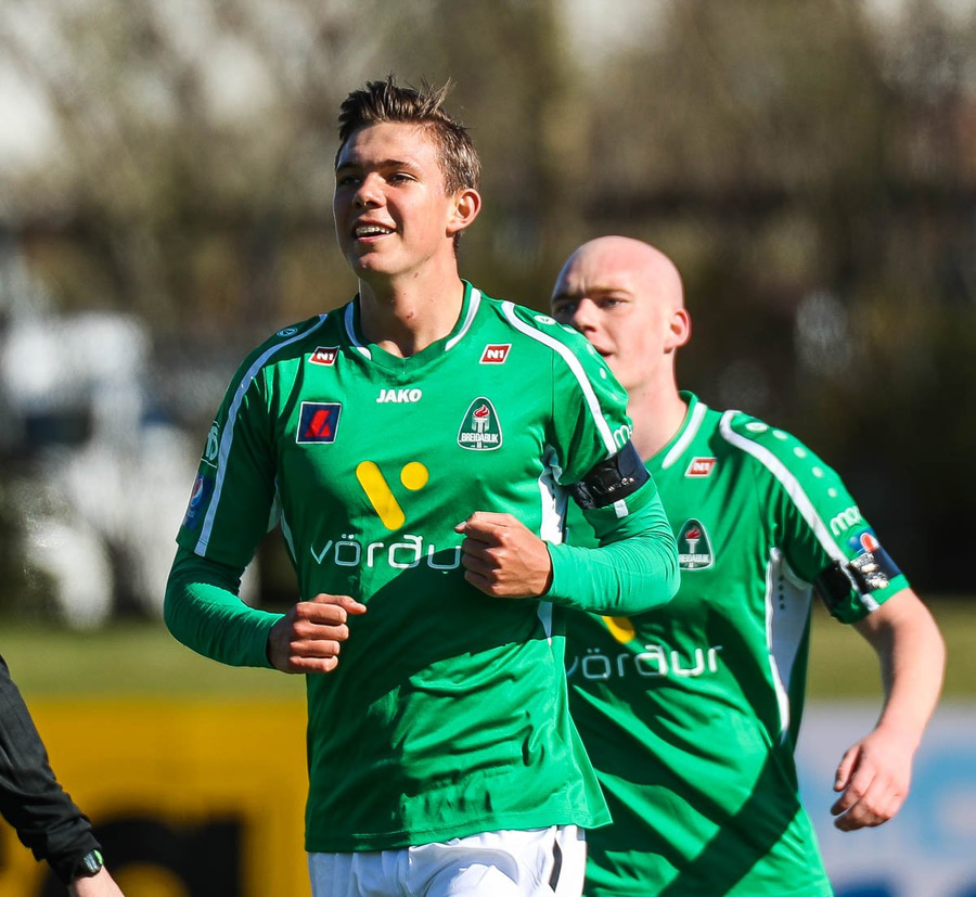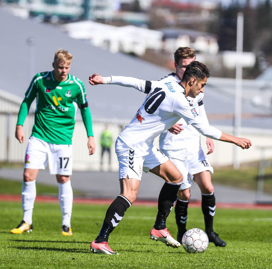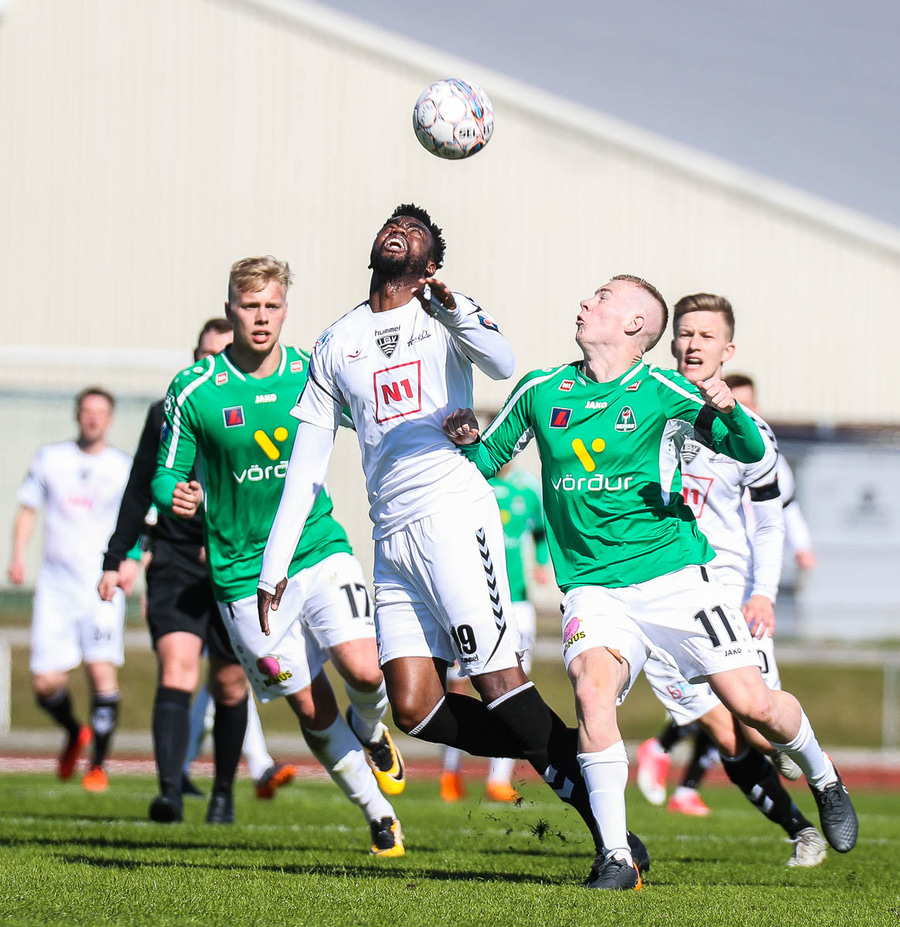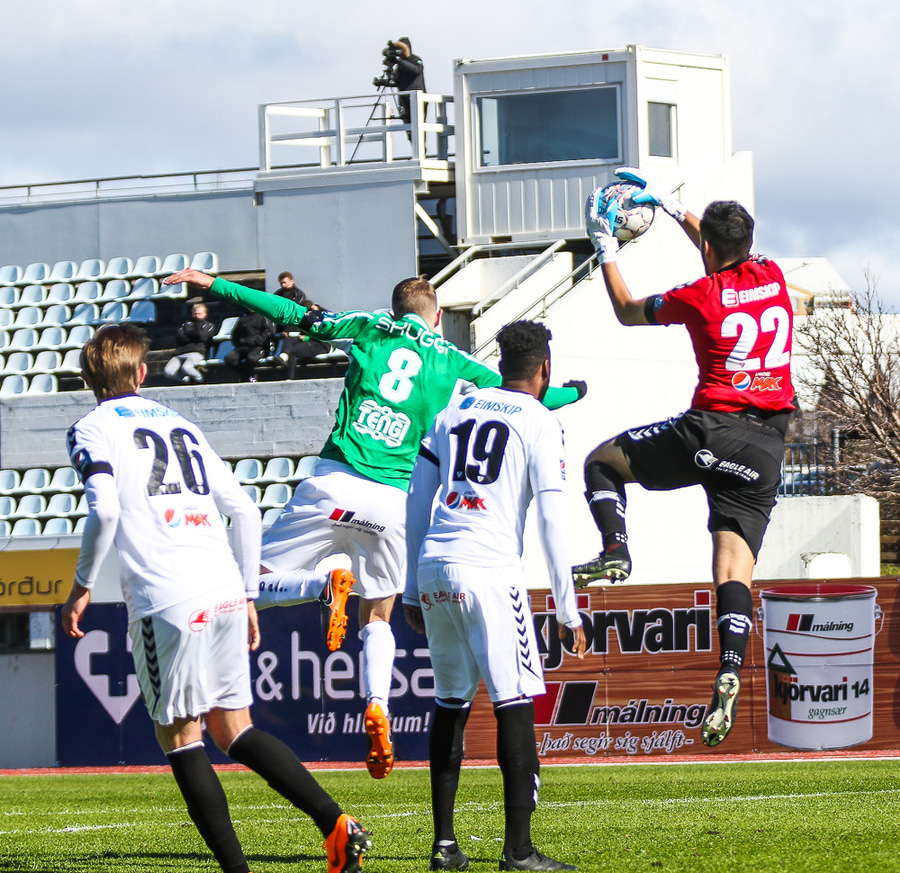 Arnþór Ari reynir fyrirgjöf frá hægri en guð minn almáttugur. Hann skóflar boltanum líklega 30 metra upp í loftið og aftur fyrir markið.
