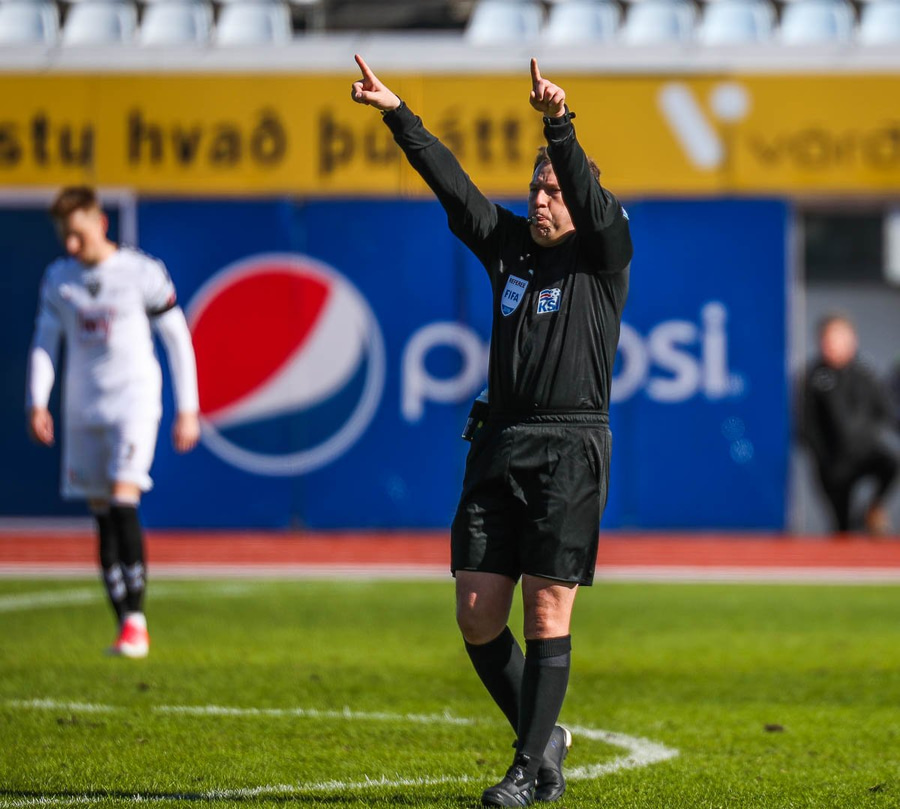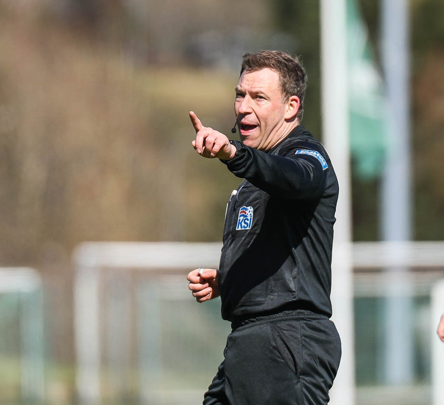 Willum Þór fellur innan teigs en Þóroddur segir unga stráknum bara að standa upp.