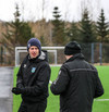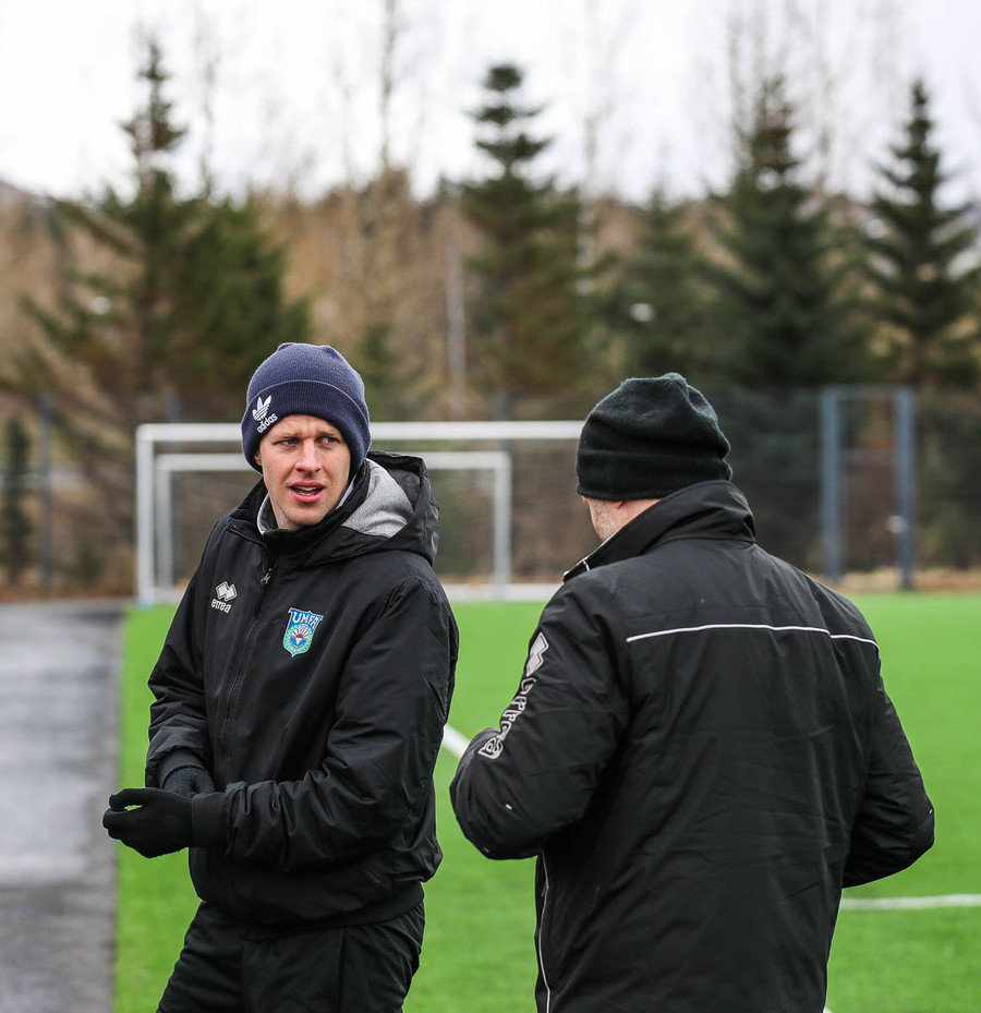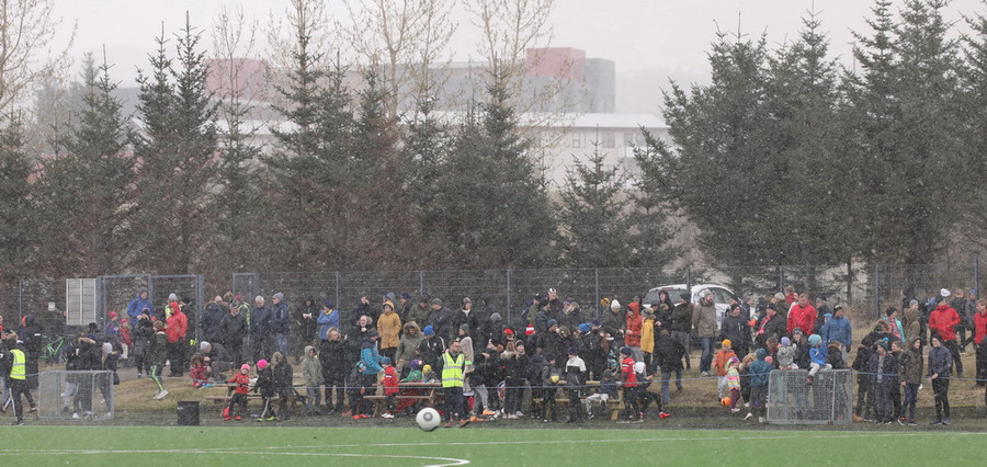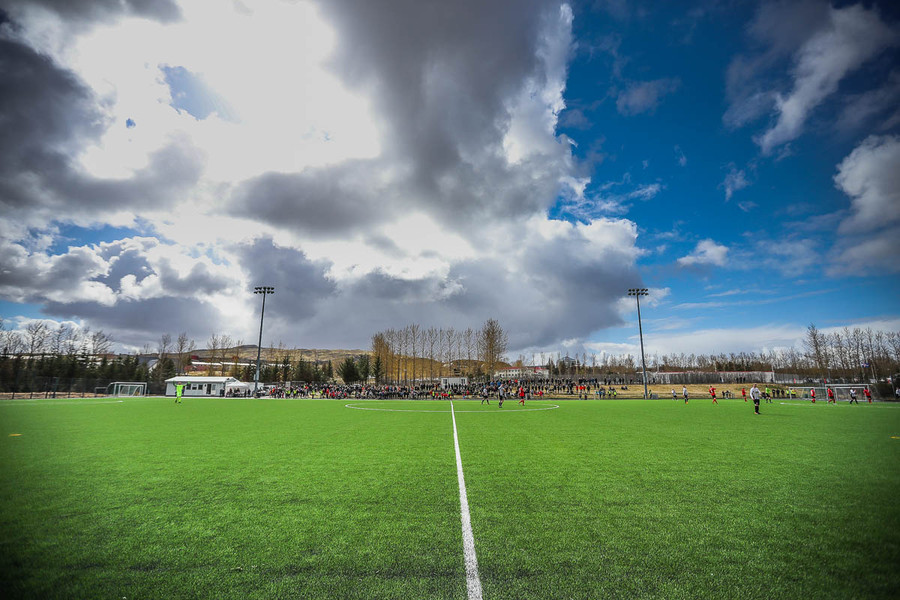 Fínar aðstæður til knattspyrnuiðkunar á gervigrasinu að Varmá í dag, logn, léttur kuldi í þessu og lítur út fyrir að það dropi innan skamms.