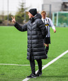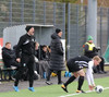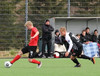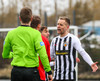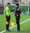 Gunnar Helgason, aðstoðardómari þarf að eiga orð við Arnar Hallsson þjálfara Aftueldingar, það er kominn hiti í Mosfellinga bæði á varamannabekknum og í stúkunni eftir ódýrar aukaspyrnur sem KR hefur fengið.