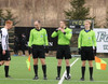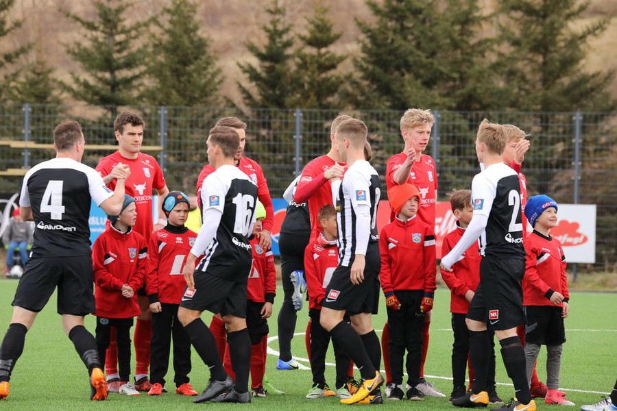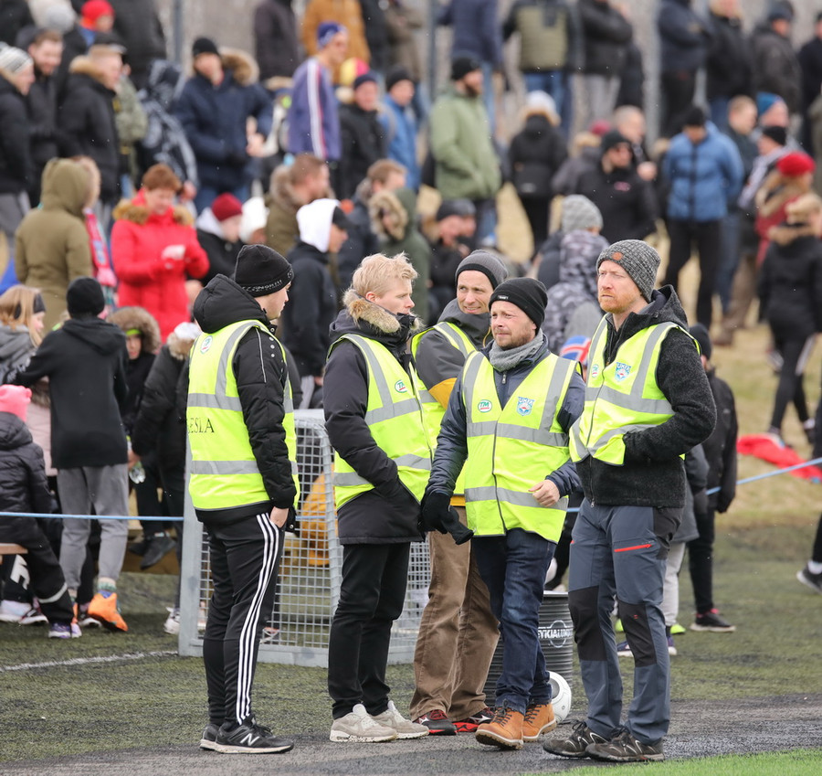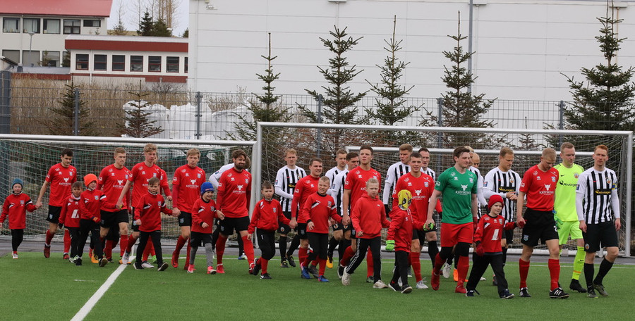 Guðgeir Einarsson og aðstoðarmenn hans leiða liðin út á völl, þetta er að bresta á!