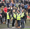 Fólk í stúkunni rífur upp regnhlífar og útilegustóla til að verja sig frá haglélinu!