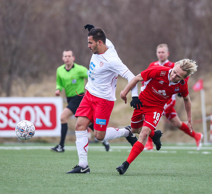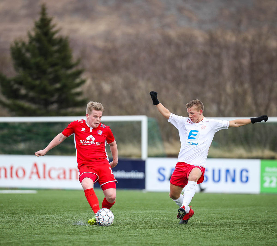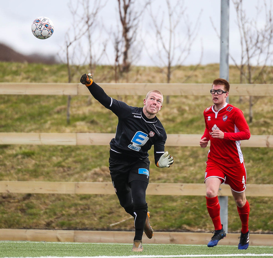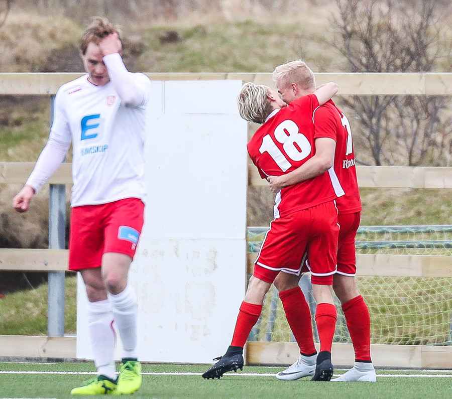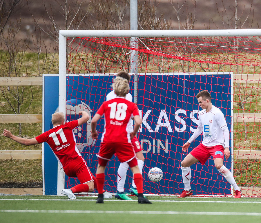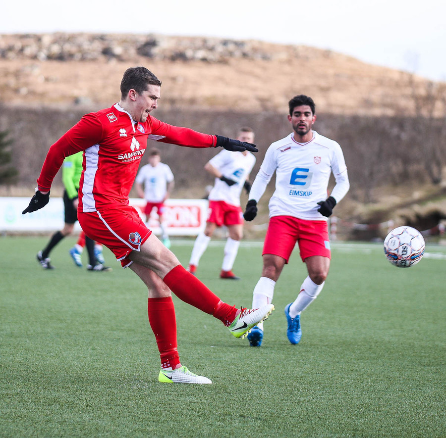 Sveinn Elías að gera sig líklega á fjærstönginn, vinnur hornspyrnu sem Hakar skalla frá. Guðni á svo skot sem fer langt yfir og framhjá