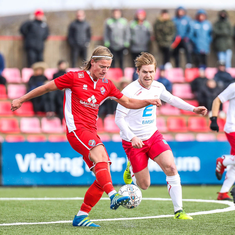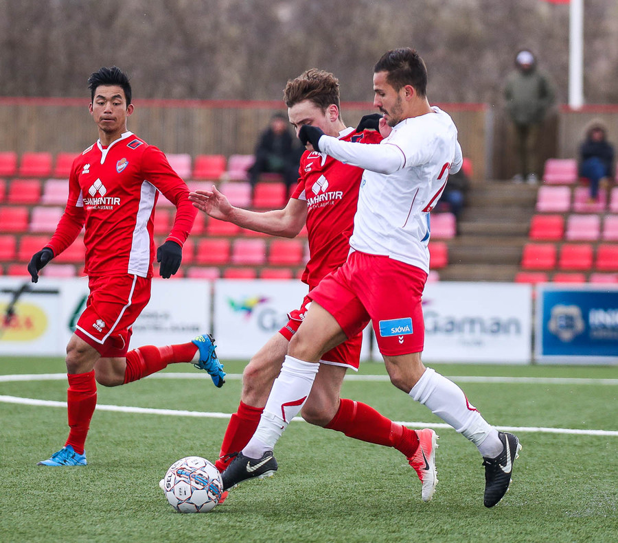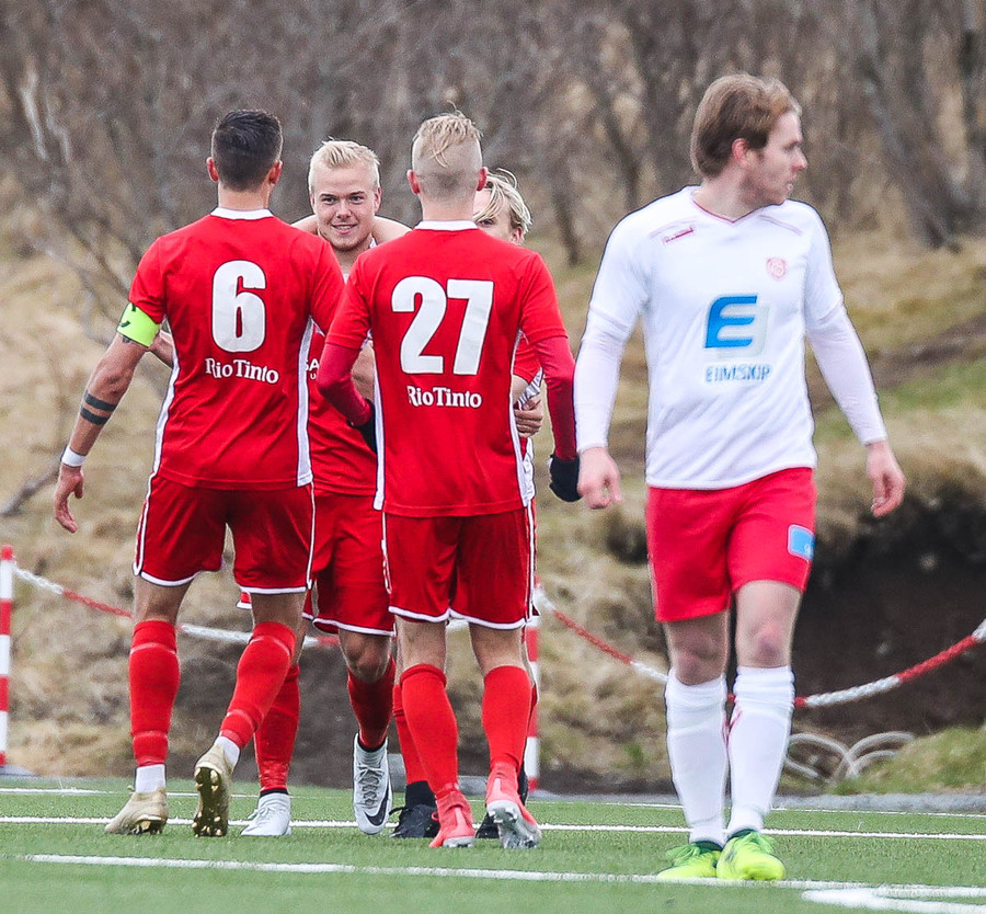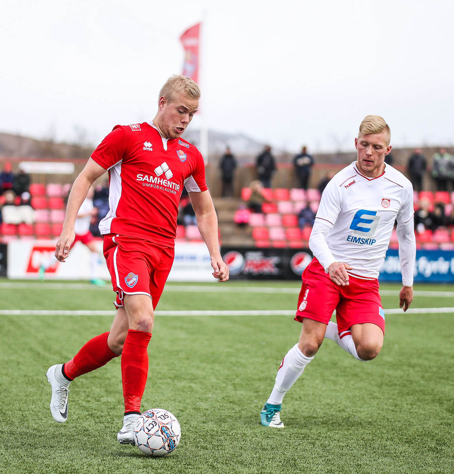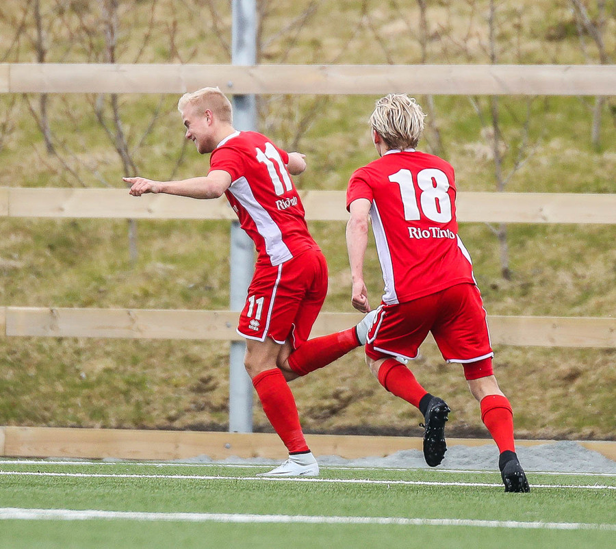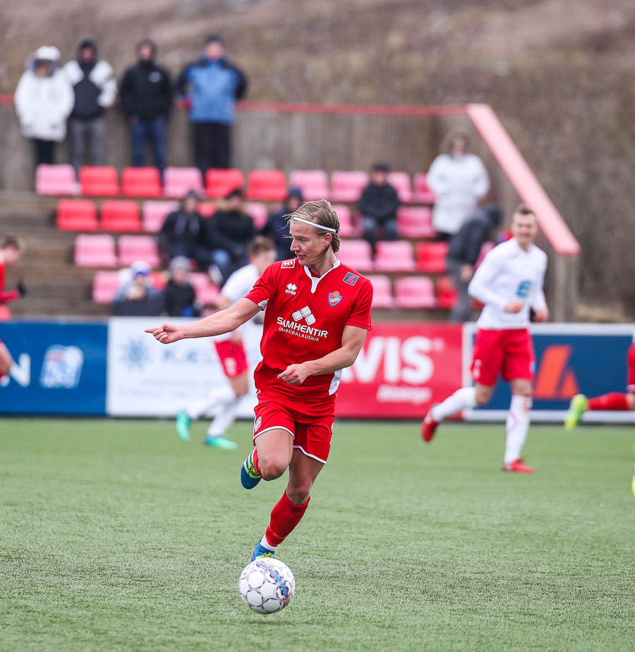 Sveinn Elías að gera sig líklega á fjærstönginn, vinnur hornspyrnu sem Hakar skalla frá. Guðni á svo skot sem fer langt yfir og framhjá