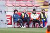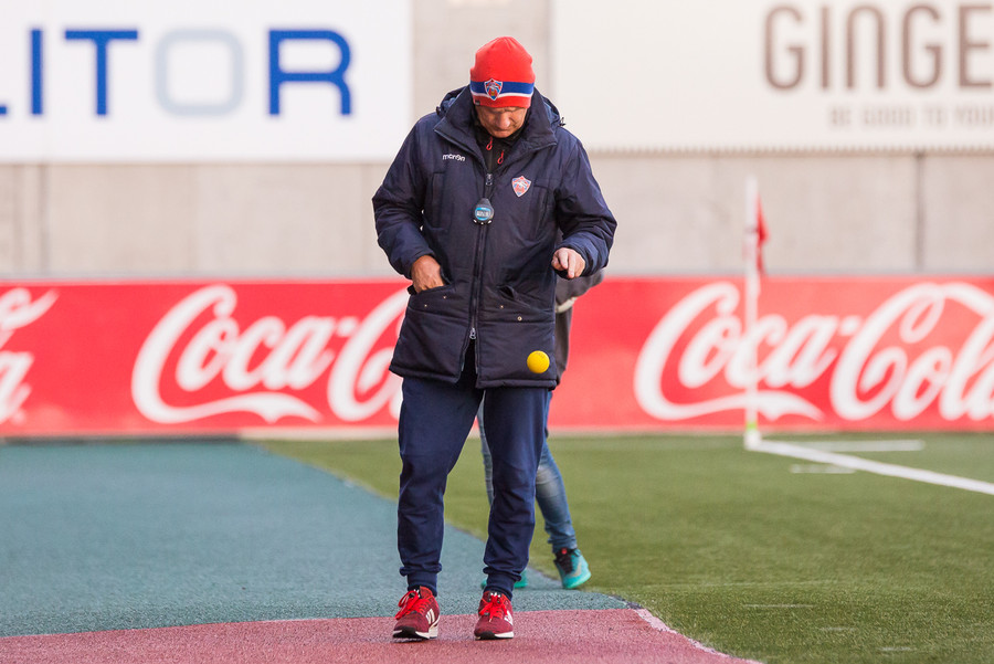 Liðin hita upp á vellinum og áhorfendur eru að týnast í stúkuna.