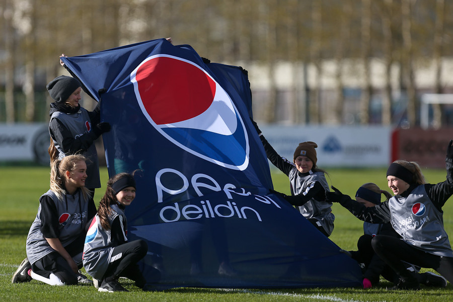 Liðin labba inn á völlinn, ungar KR-stelpur labba með þeim.