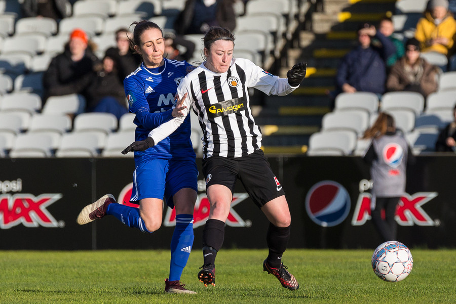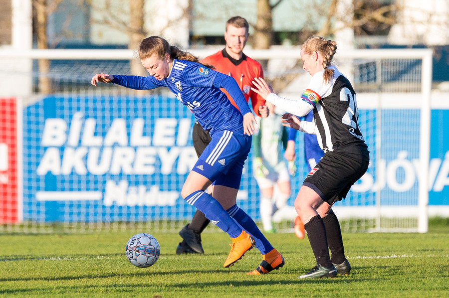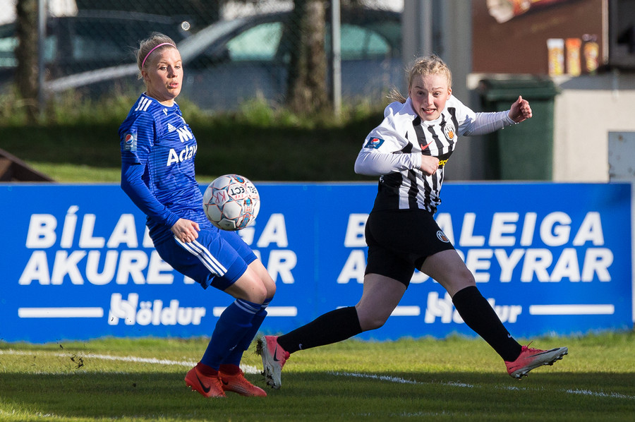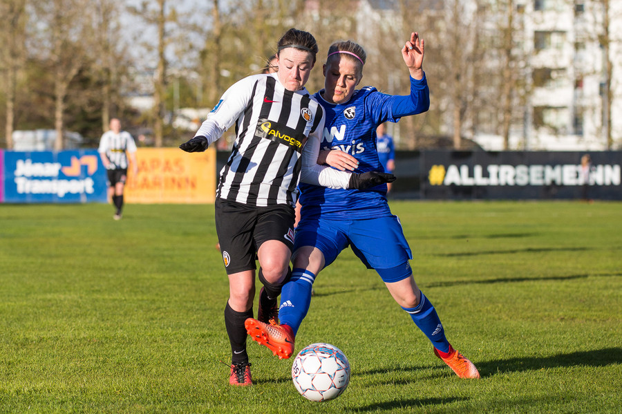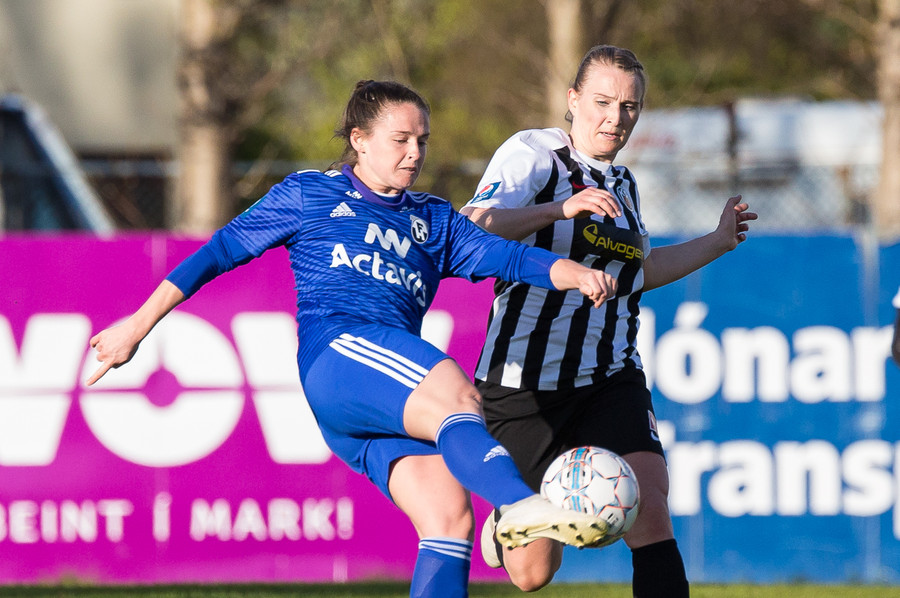 Marjani með fyrirgjöf sem endar afturfyrir. Ingibjörg með sólina í andlitið þarna