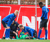 Fran Marmolejo liggur hér eftir inn í teig eftir að hafa komið út i bolta og fallið illa í samstuði. Þetta lítur ekki vel út og Víkingsr hafa engan varamarkmann á bekknum