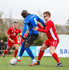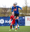 Eli Keke í hörku skallafæri en skallinn hans fer framhjá markinu. Haukar þurfa að vakna aðeins í föstum leikatriðum.