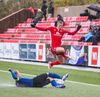 Davíð Ingvars liggur í grasinu eftir samskipti við Kwame. Víkingar hafa látið Davíð finna fyrir því í dag.