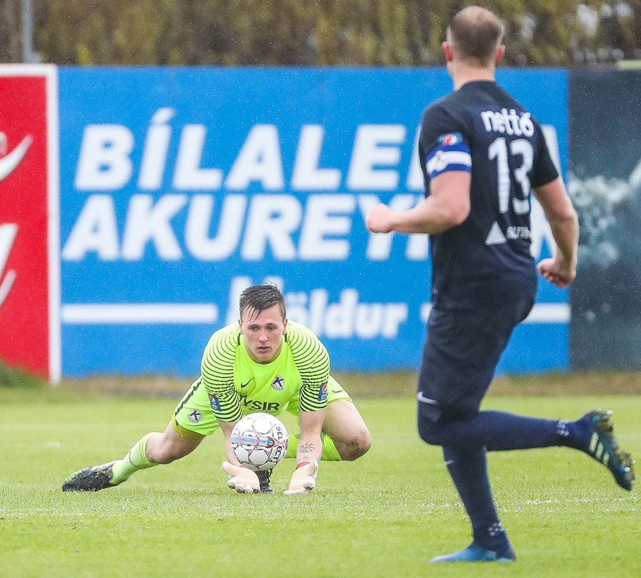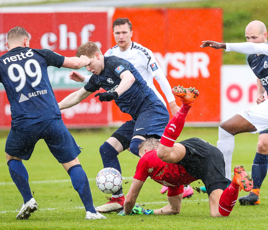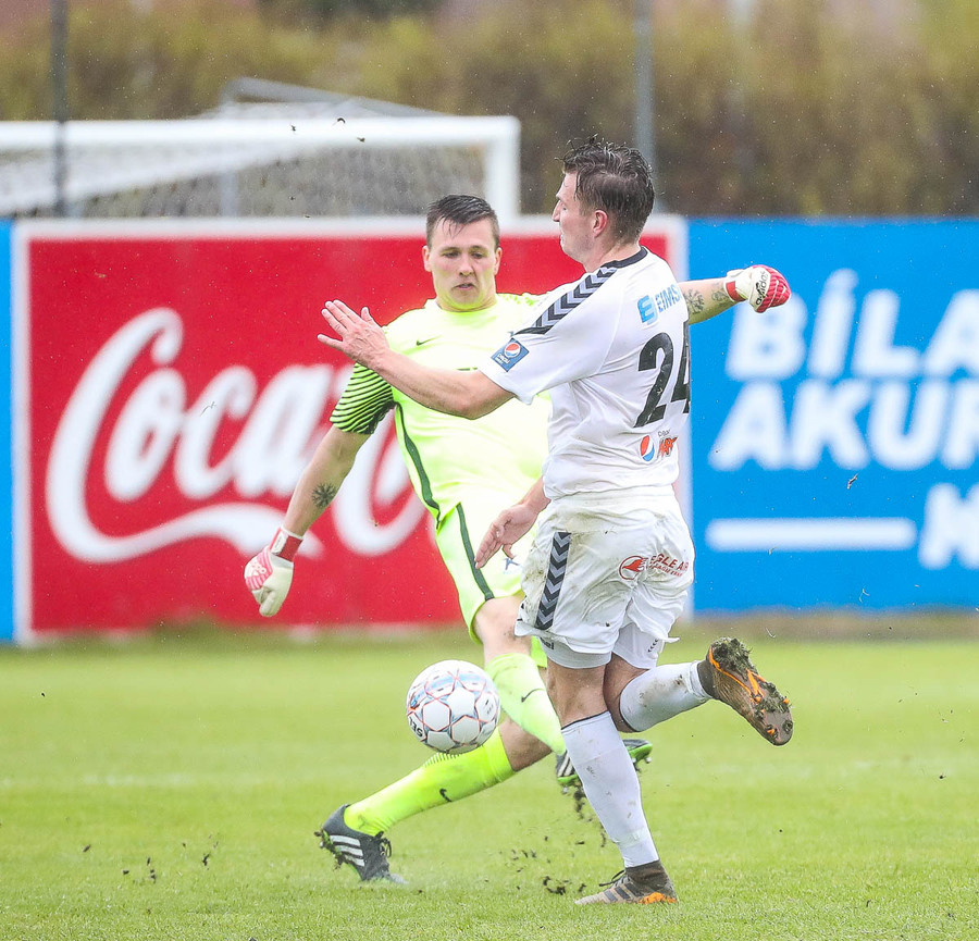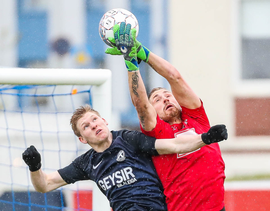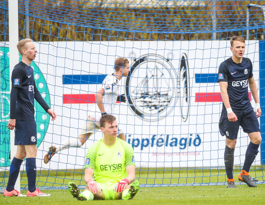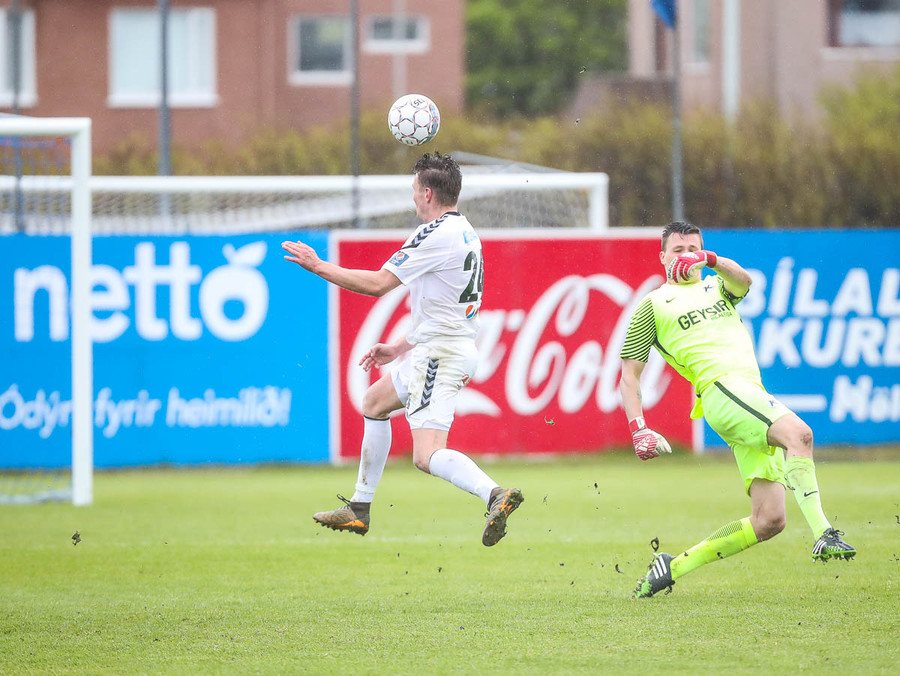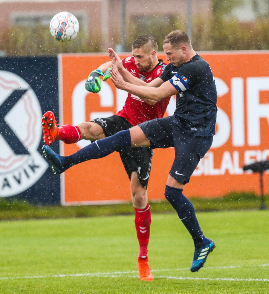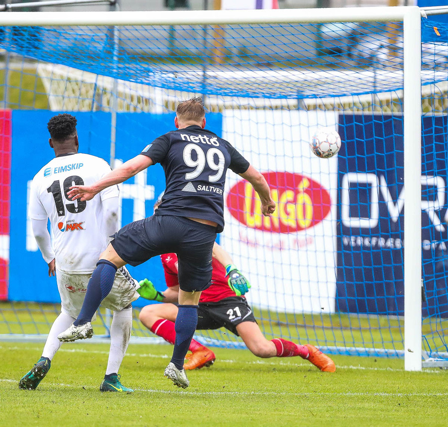 Keflavík í sókn, blokkað af vörninni. Boltinn berst fram völlinn, Sindri kemur á móti. Hann var greinilega enn að hugsa um vin sinn Karius og sparkaði kenttinum í Sigurð Grétar. Hann þakkaði pent og renndi boltanum í autt markið.