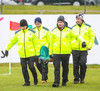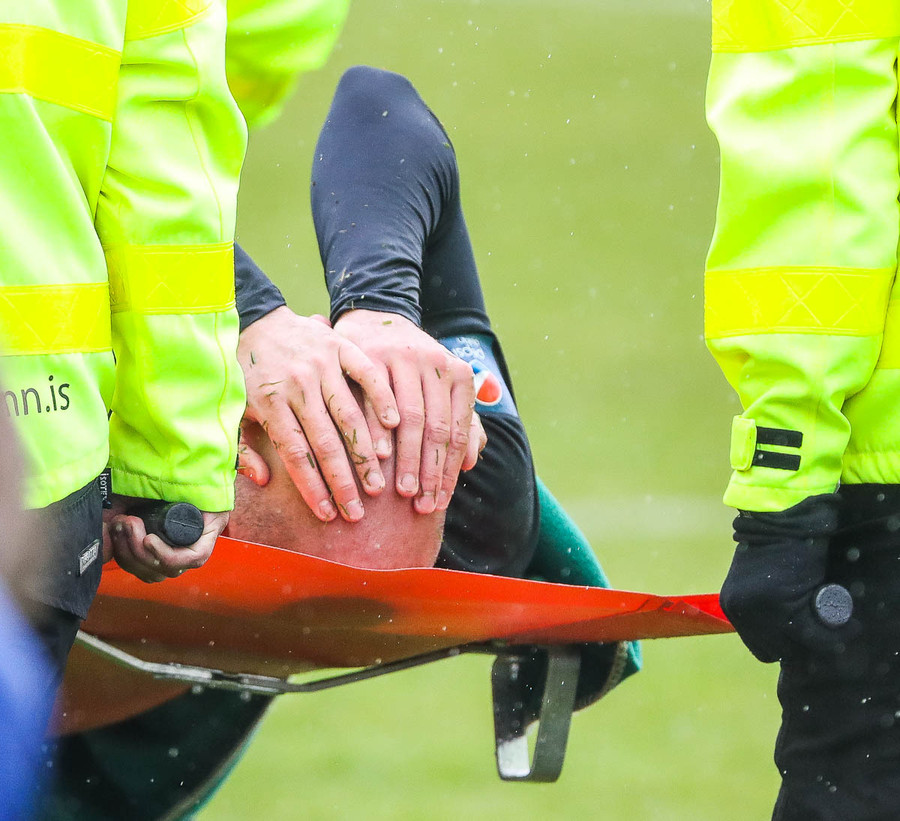 Sigurbergur Elísson liggur hér sárþjáður eftir samstuð við Halldór Pál. Starfsmenn að koma með börur. Virðist sem þetta séu hnémeiðsli. Ekki góðar fréttir fyrir Keflvíkinga. Vonum innilega að þetta sé ekki alvarlegt.