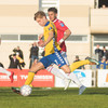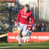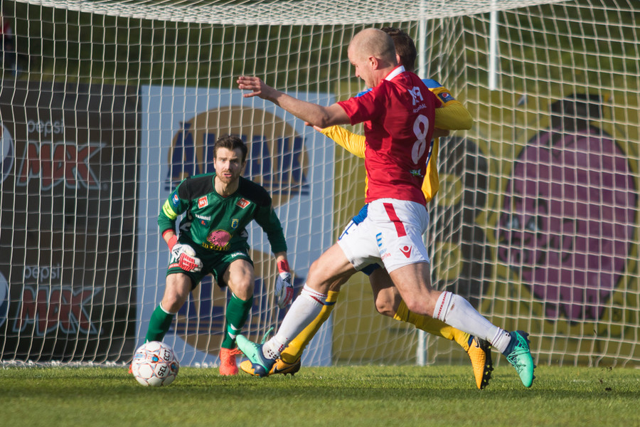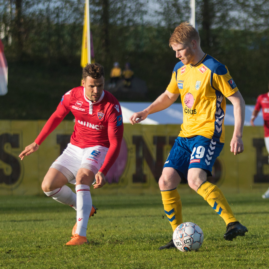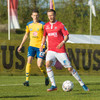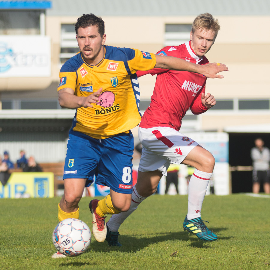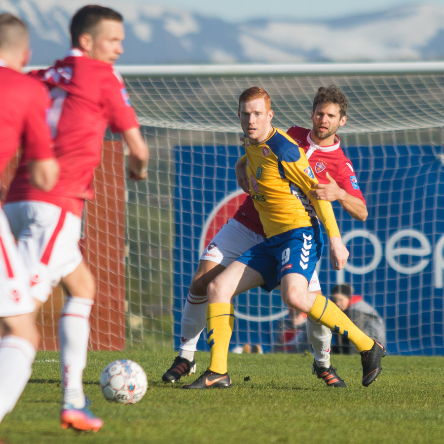 Andri Adolphs vinnur boltann af Valgeiri á hættulegum stað og rennir honum út í teiginn á Tobias sem á slakt skot í varnarmann.