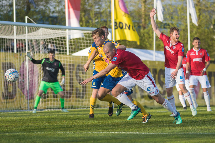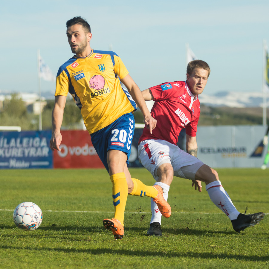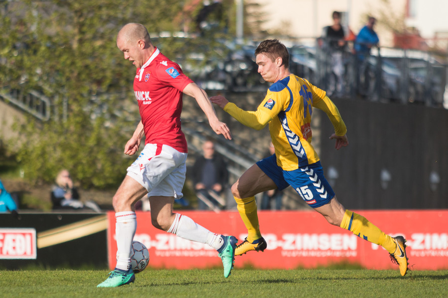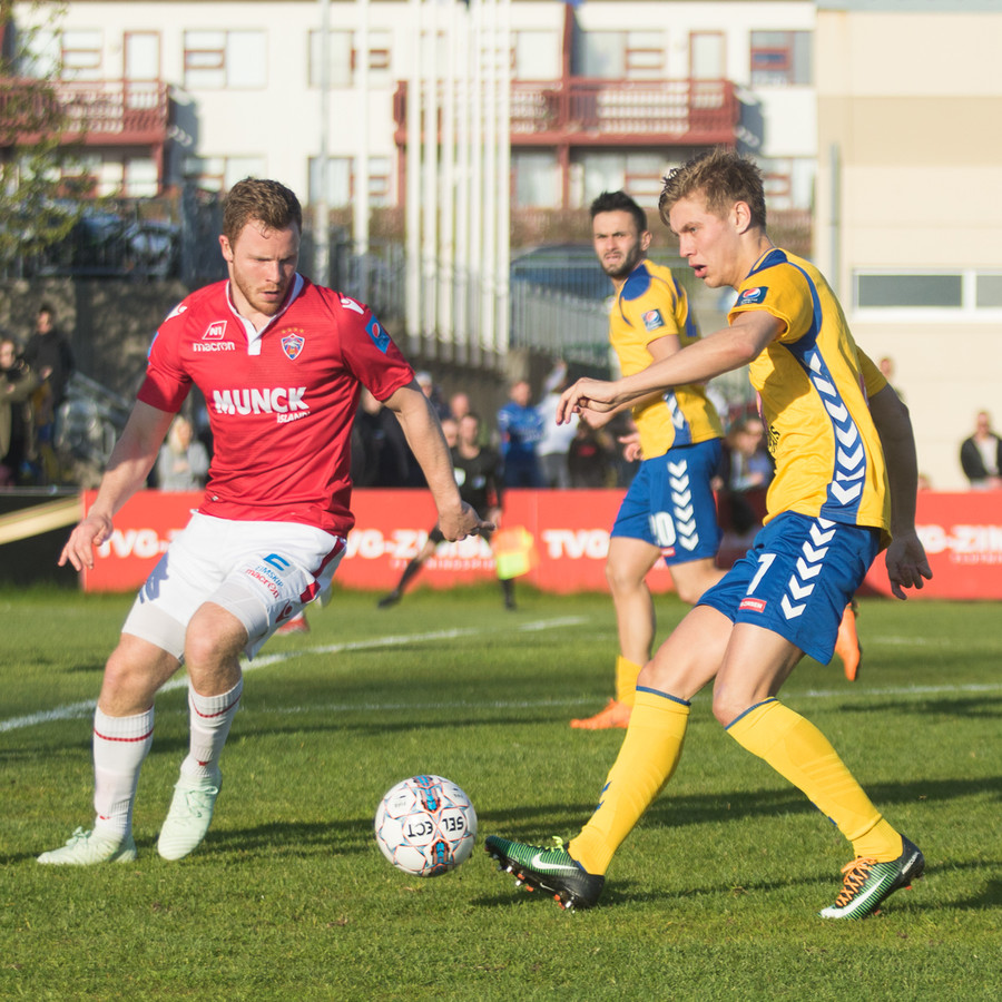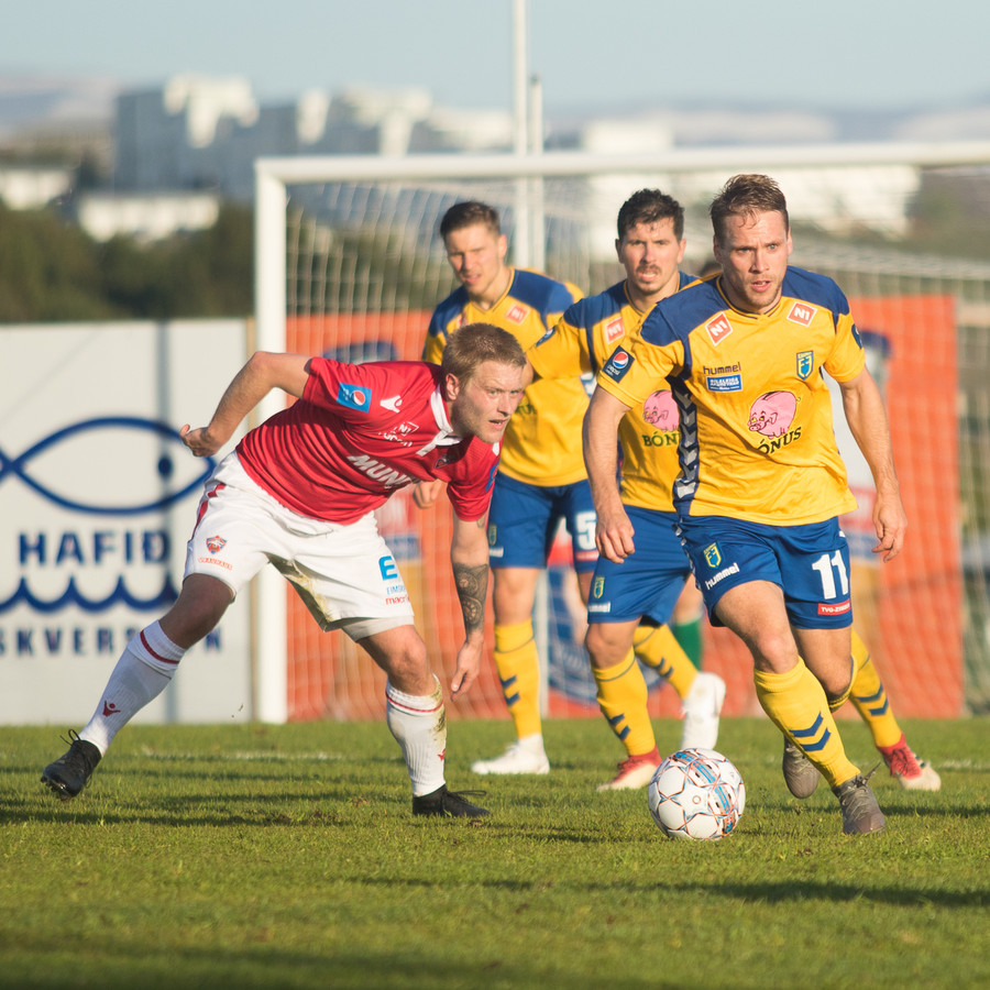Birnir Snær er hérna að fífla Arnar Svein upp úr skónum og boltinn berst síðan á Hans Viktor sem hamrar honum yfir. Þeir fiska sem róa.
