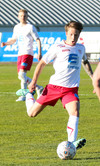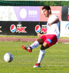 Barrie á hér skot tilraun lengst utan af velli sem fer vel yfir.