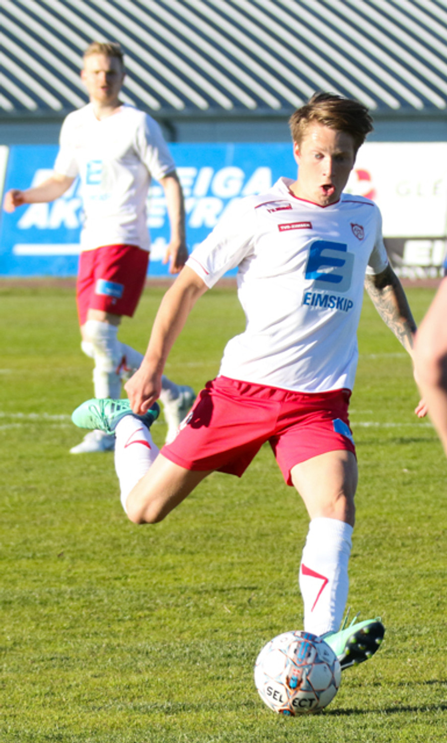 Aðstæður eru góðar hér á Akureyri. Sólin skín, lítill vindur og völlurinn lítur þokkalega vel út. Ættum að fá góðan knattspyrnuleik hér í kvöld enda tvö sterk lið sem eigast við.