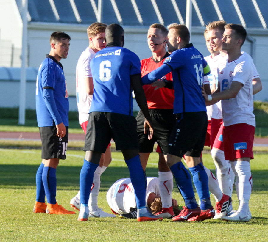 Kwame Quee virðist hér slá til Jónasar. Stuðningsmenn Þórs alls ekki sáttir og vilja að Einar Ingi taki á málinu. Einar dæmir þó ekkert.
