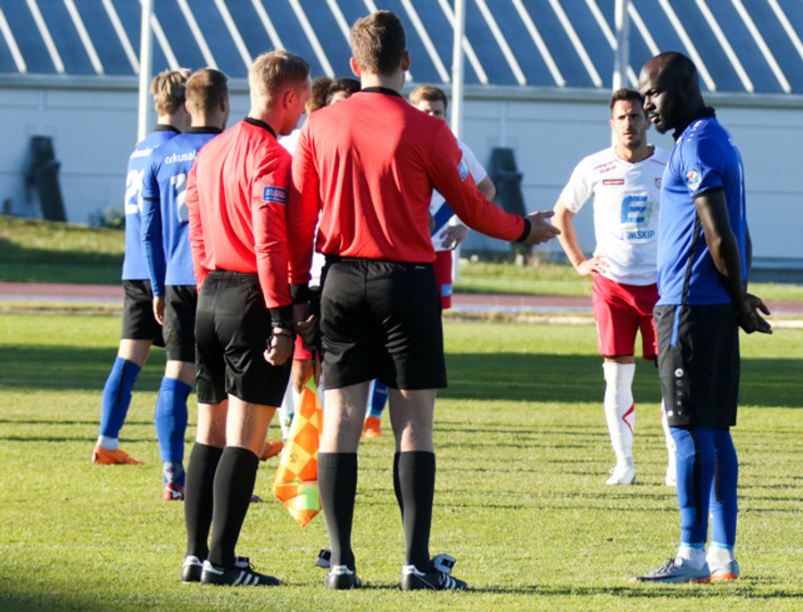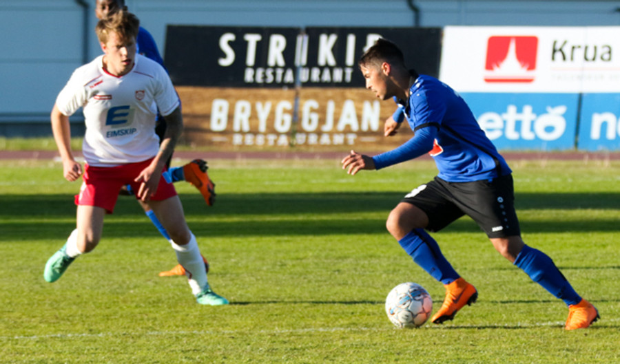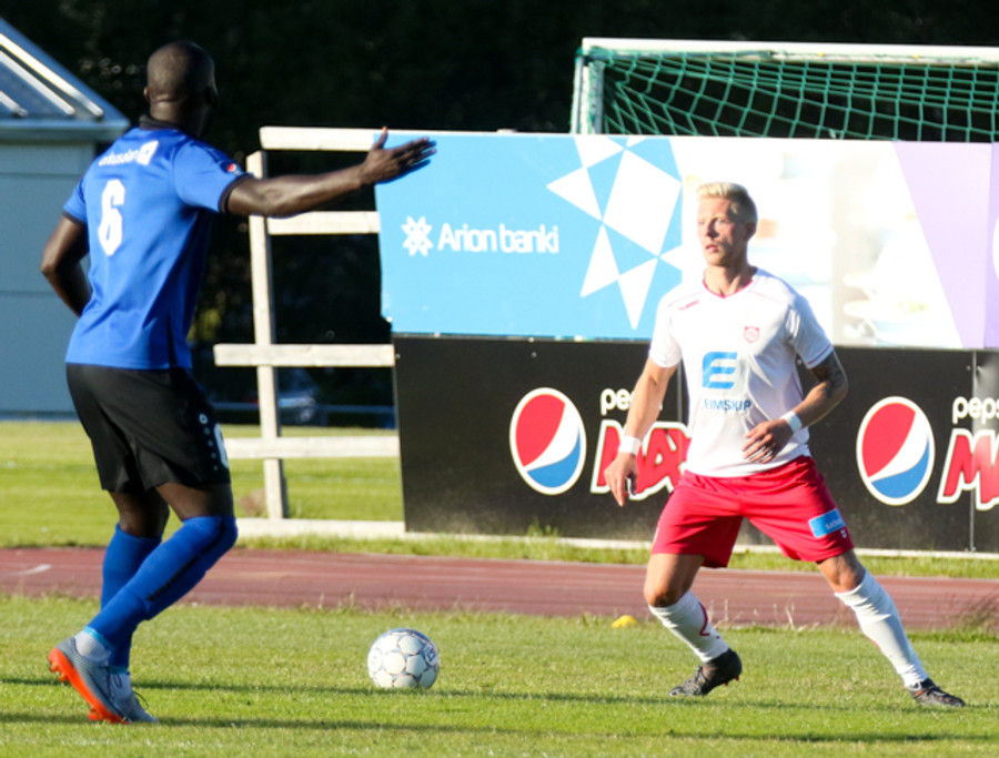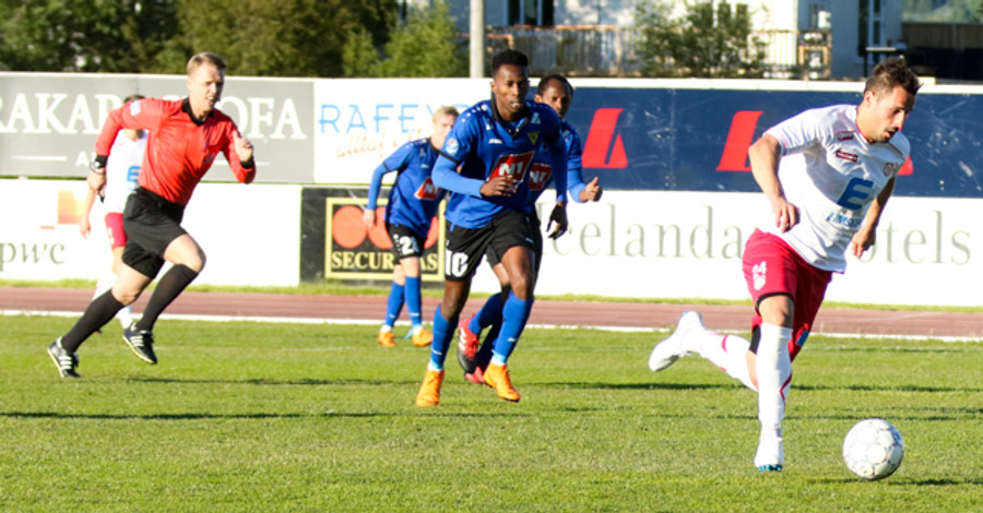 Óskar Zoega hér dæmdur brotlegur úti kannti. Hann verður að gæta sín enda á gulu spjaldi.