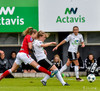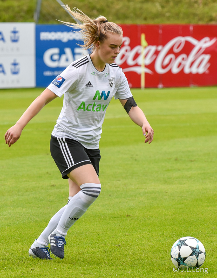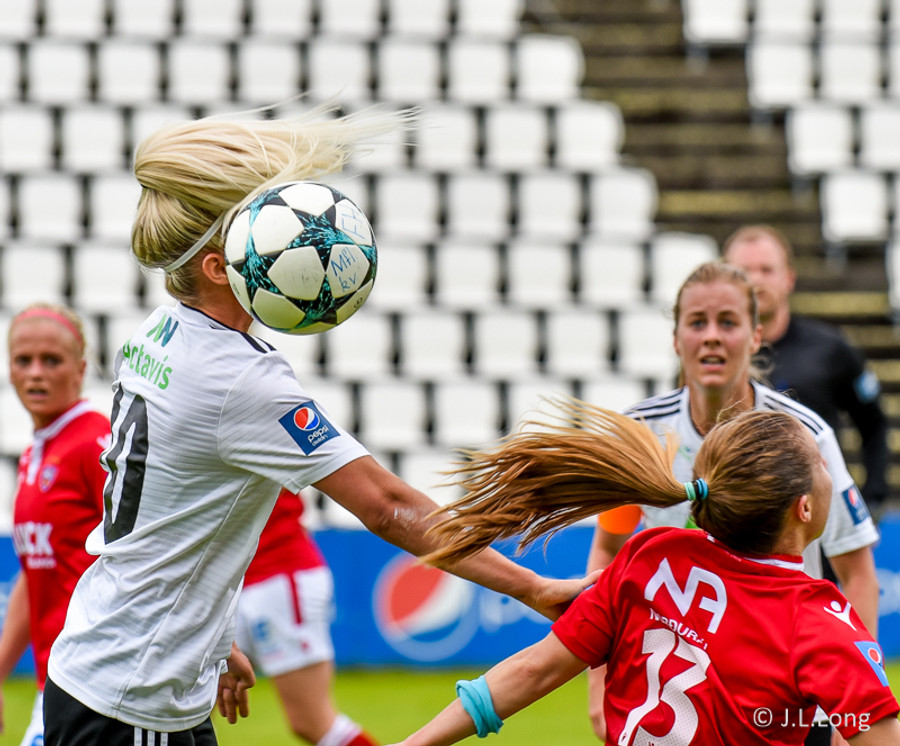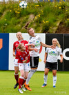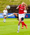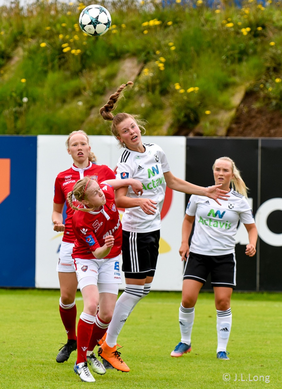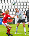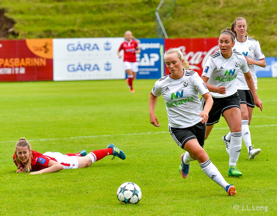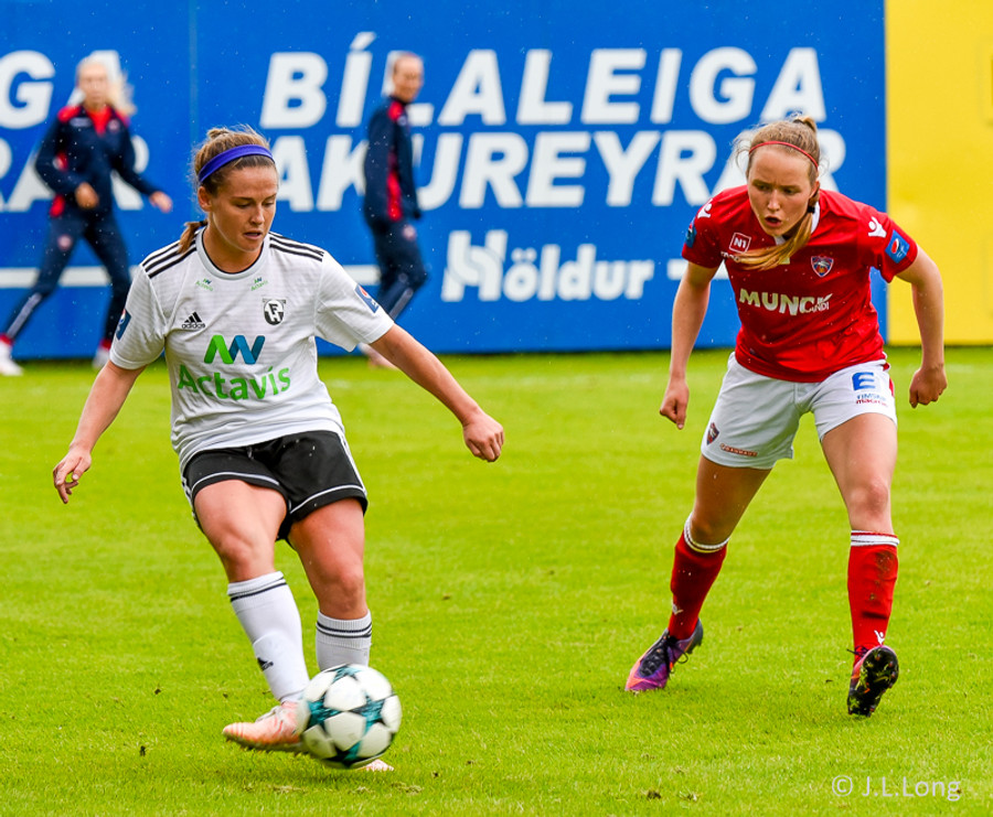 Góð spyrna frá Hallberu sem að Málfríður vinnur skallaboltann sem fer beint á Hlín en skallinn hennar er yfir markið.