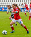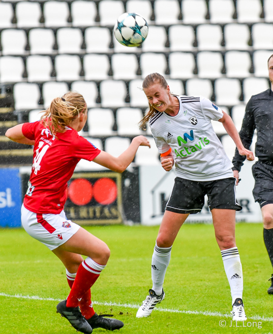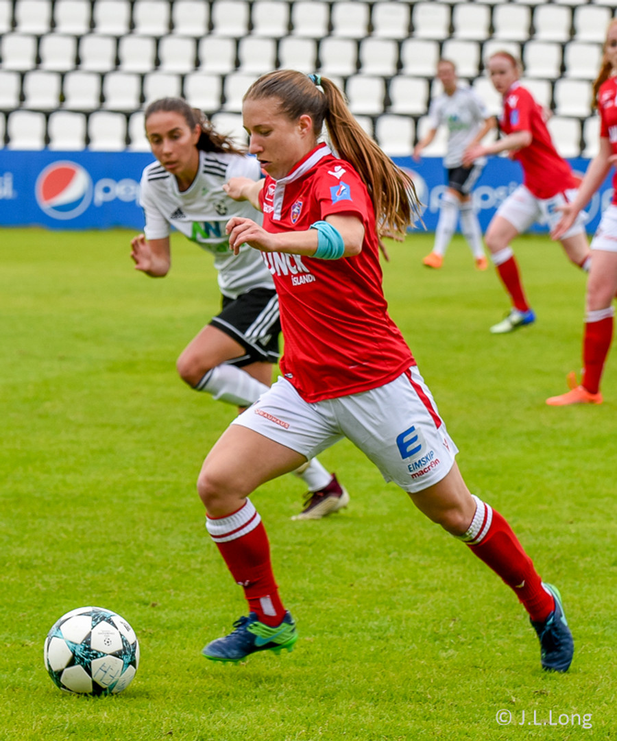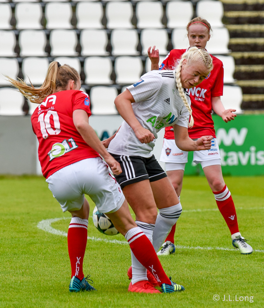ÚFF! Málfríður Anna með geggjaðaaaaa fyrirgjöf beint á kollinn á Hlín en skallinn hennar fer rétt framhjá markinu!
