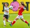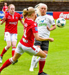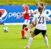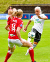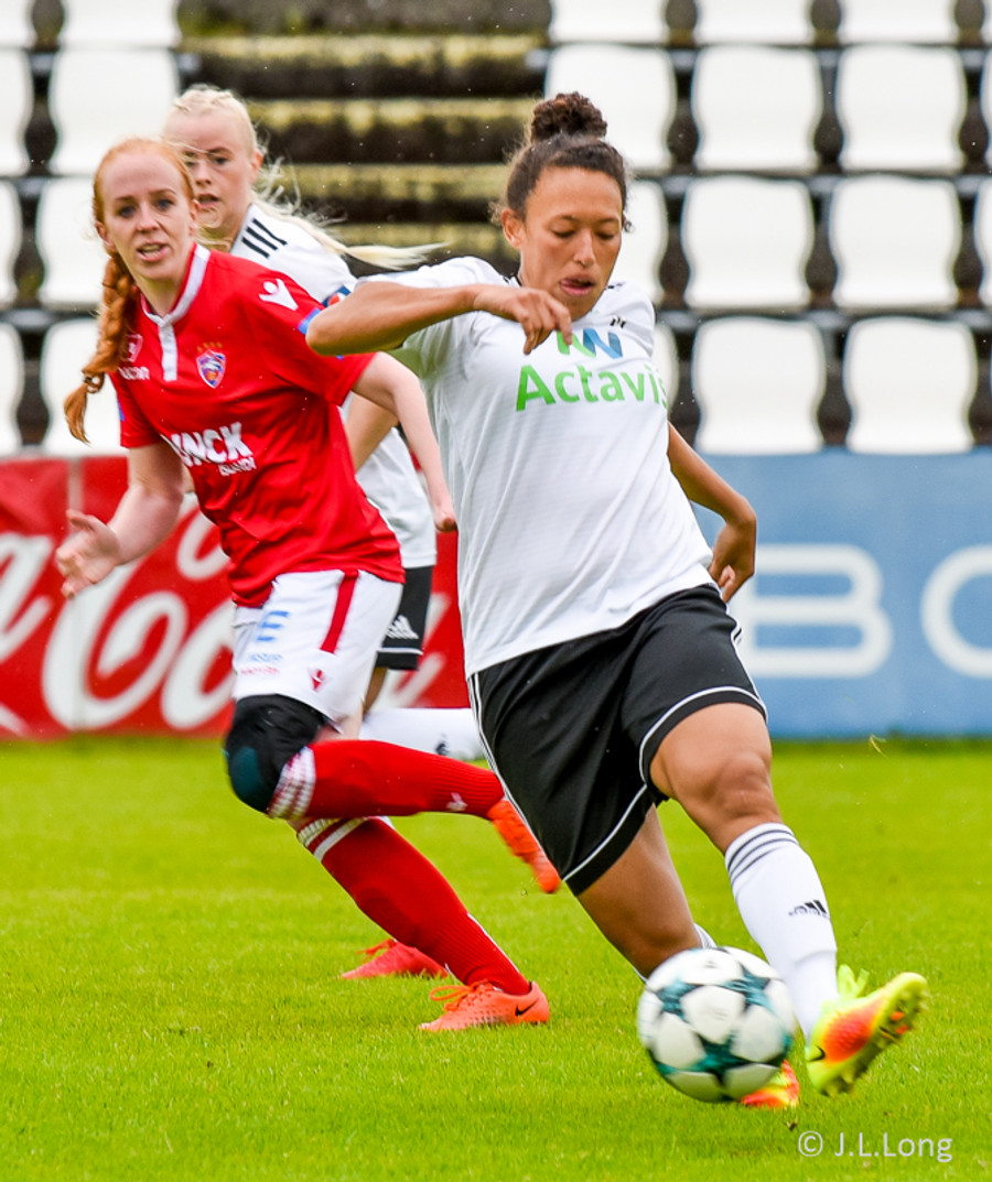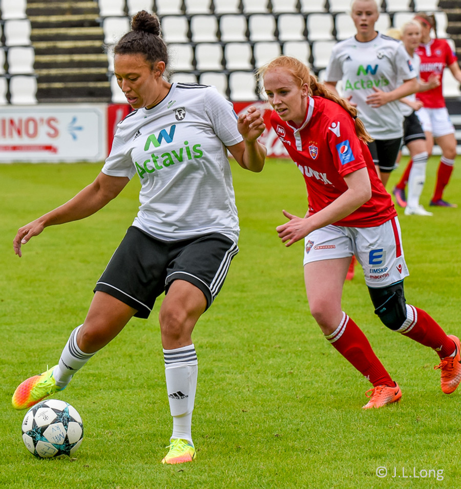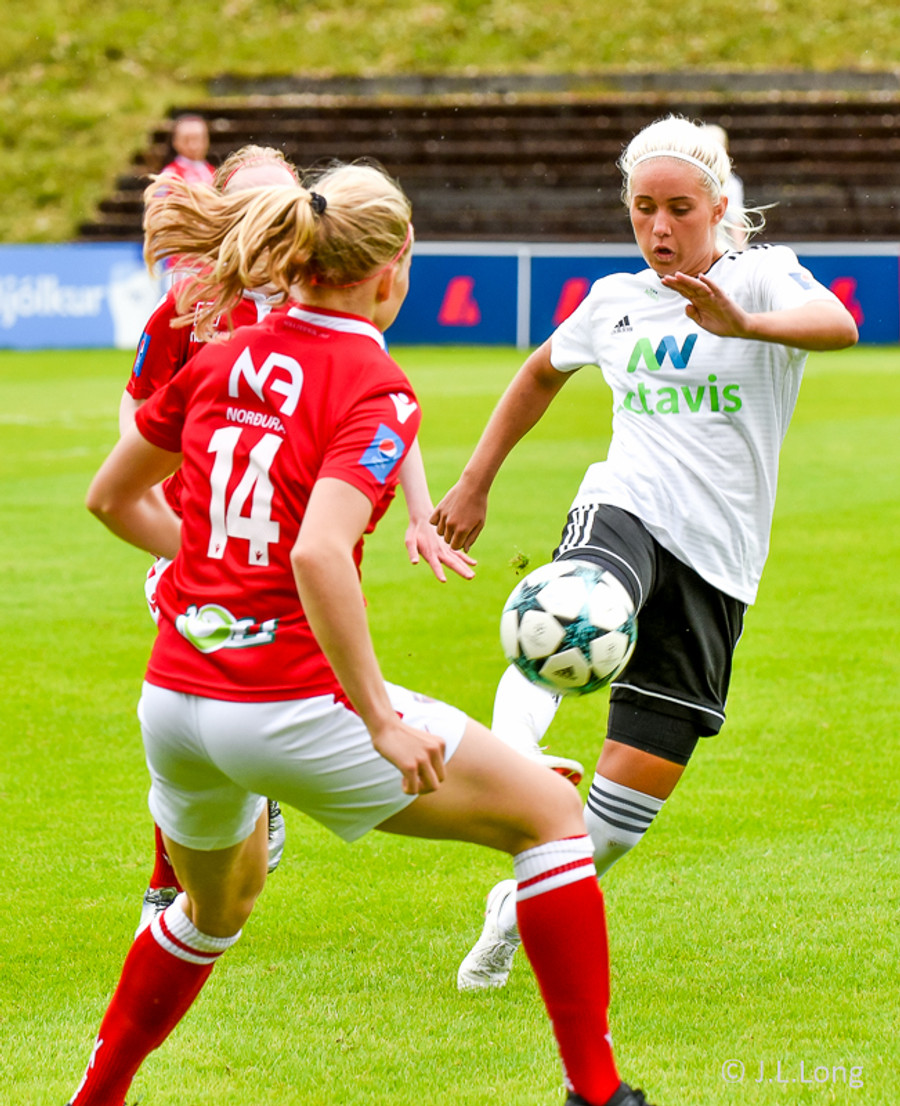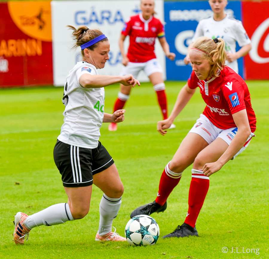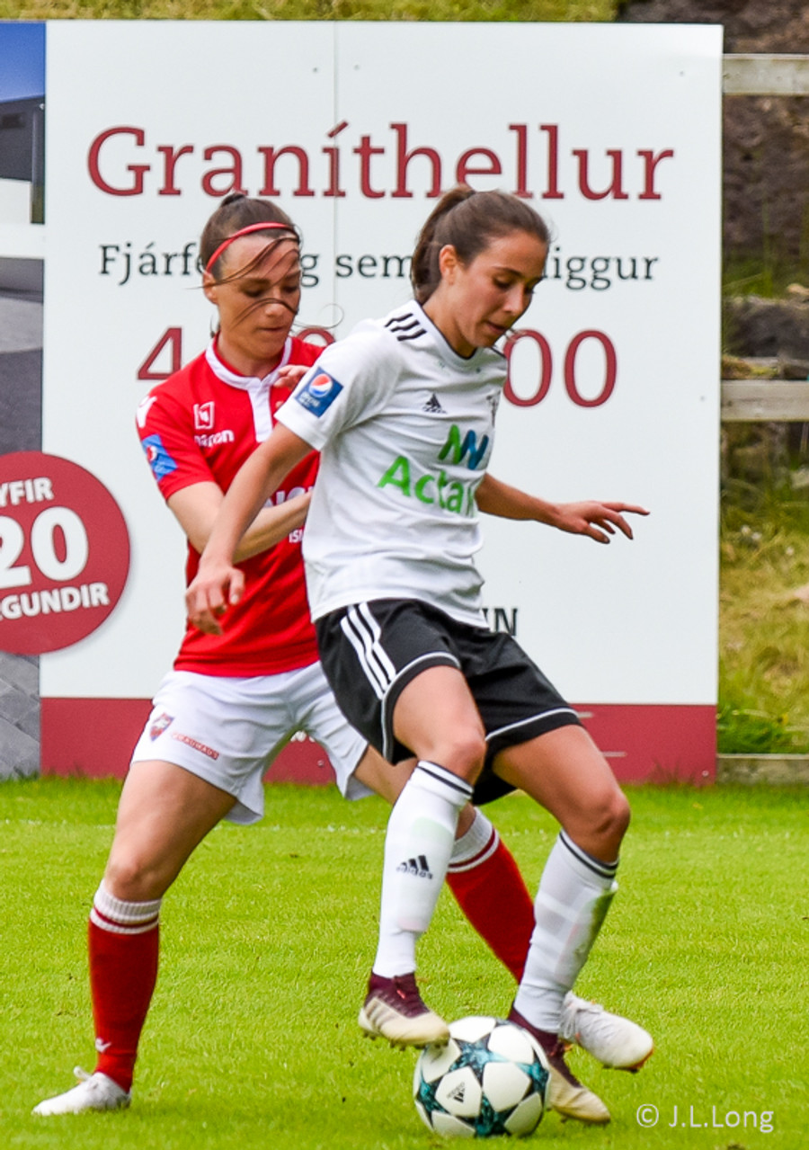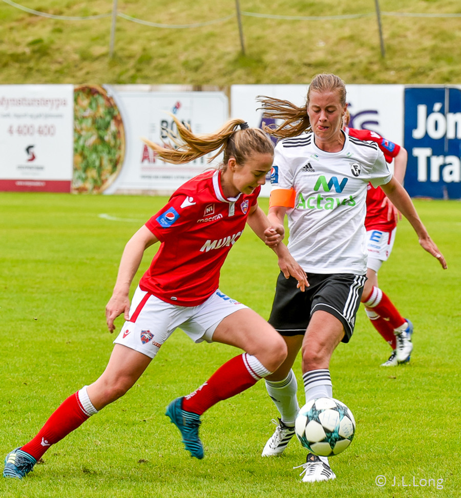 Marjani í baráttunni við Hallberu sem að kemur boltanum aðeins frá en ekki langt þar sem Halla Marínós mætir og mundar skotfótinn en skotið fer hátt yfir markið.