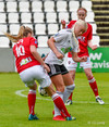 Var Arna að æfa fjölbragða glímu? Elín Metta fór illa með tvo varnrmenn FH með skemmtilegum tilþrifum og Arna með góðu glímutaki skellir henni niður.