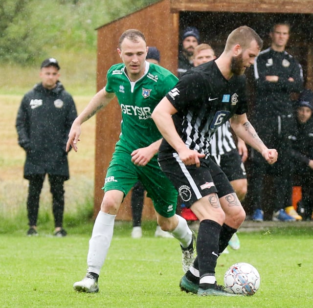 Rennblautur völlurinn farinn að hafa áhrif á leikinn, Magnús Þór rennur hér á sínum vallarhelming. Magni kemst í skyndisókn upp úr því en Gunnar Örvar var ekki alveg viss hvað hann ætlaði að gera við boltann og ekkert verður úr sókninni