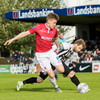 Eiður Aron tekur Chopart niður með glímutökum við hliðarlínuna.