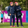 Siggi Helga mættur með kaffibolla, Stefán Árni Pálsson stjörnublaðamaður búinn að koma sér fyrir við hlið mér, Byssan og Bogi Ágústsson mættir í KR-útvarpið og Tómas Þór og Benni Bóas búnir að versla við Fish and Chips vagninn. Allt eins og það á að vera á meðan liðin hita upp!