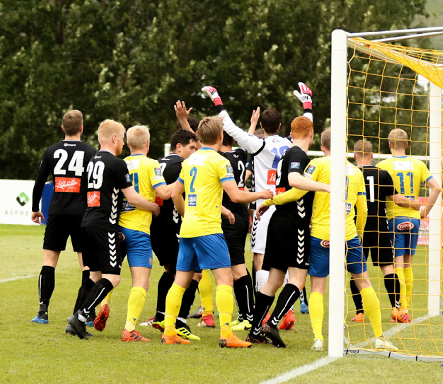 Fyrsta aukaspyrna er KA manna á fínum stað fyrir fyrirgjöf. Hallgrímur stendur yfir boltanum. Hann hittir á kollinn á Guðmann en hann nær ekki að stýra honum á markið