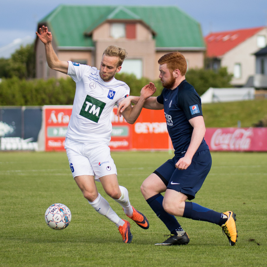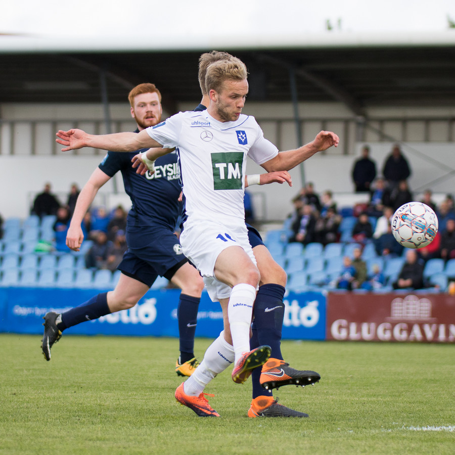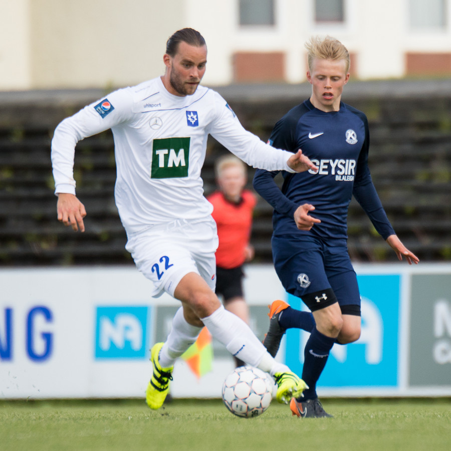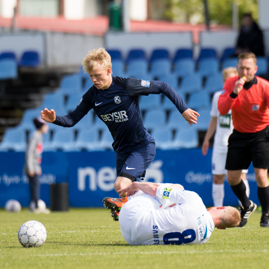 Dagur Dan fær fyrsta gula spjald leiksins fyrir kjánalegt brot á Baldri. Sparkaði hann bara niður á miðjum velli