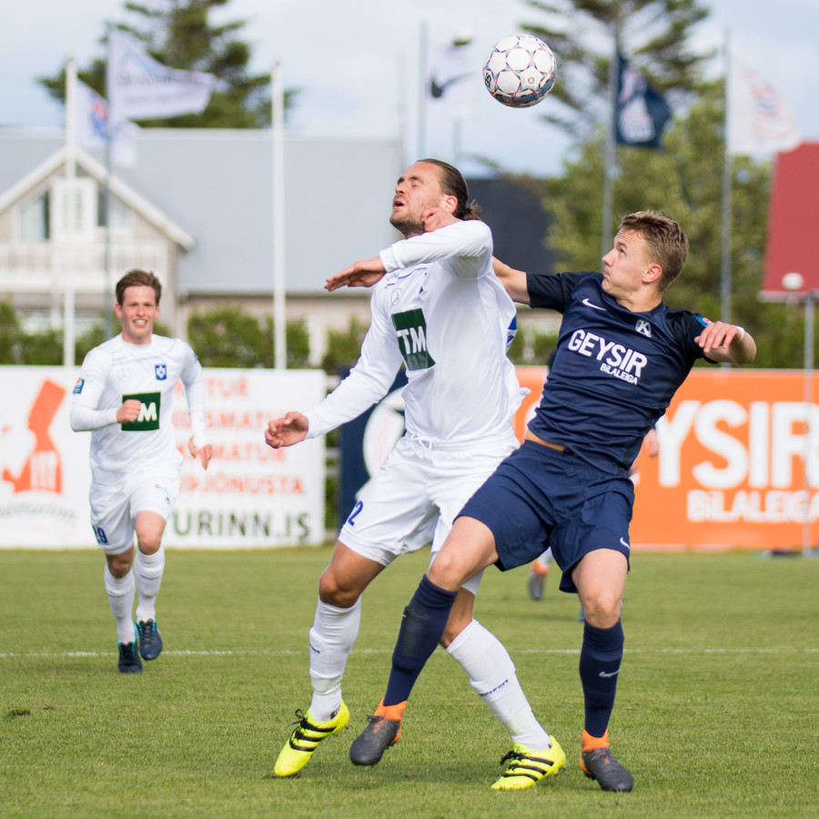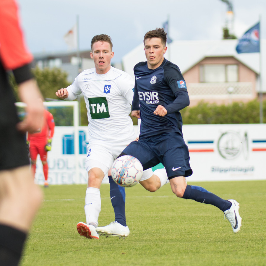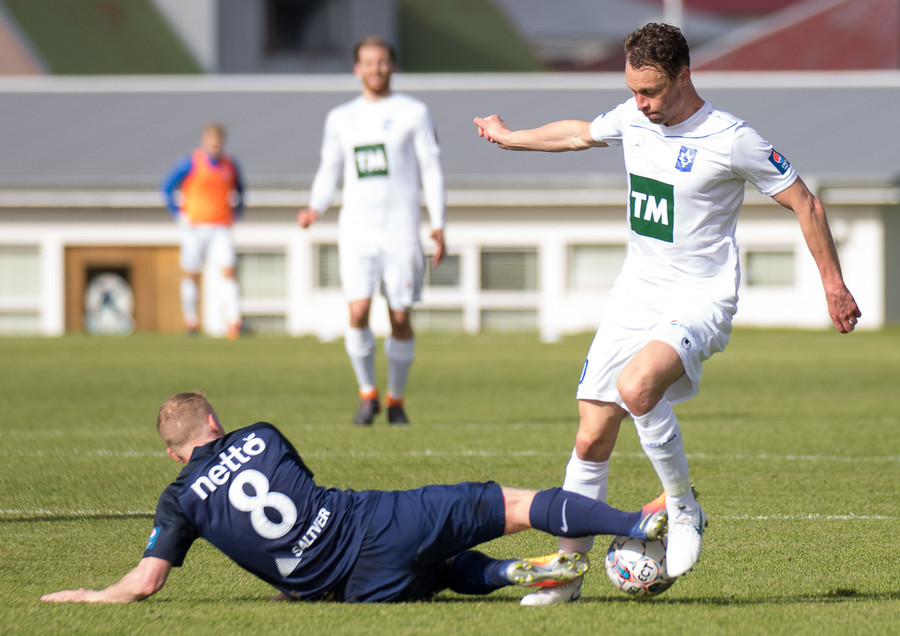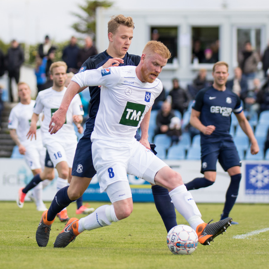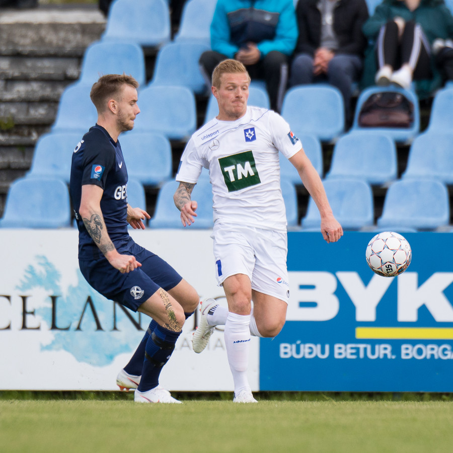 Dagur Dan fær fyrsta gula spjald leiksins fyrir kjánalegt brot á Baldri. Sparkaði hann bara niður á miðjum velli