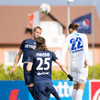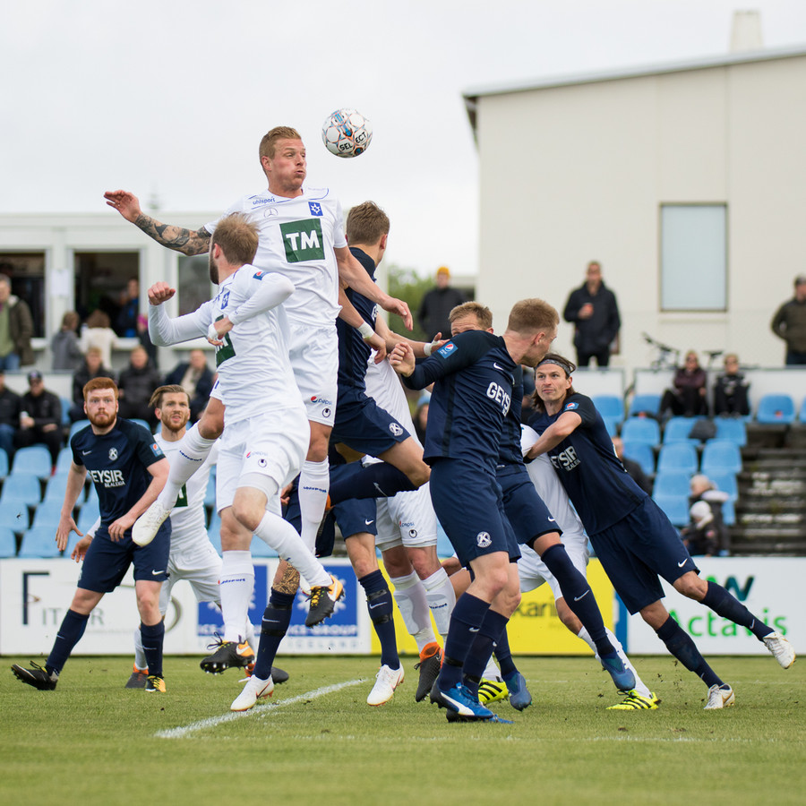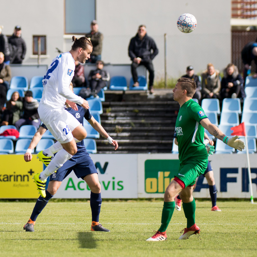 Keflavík fær hornspyrnu eftir klúðurslega hreinsun. Ísak nálægt því að stýra skallanum í markið.