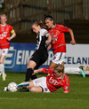 Shea fíflar illa tvo varnarmenn ÍBV við teiginn og skýtur af markboganum og boltinn syngur í hliðarnetinu!