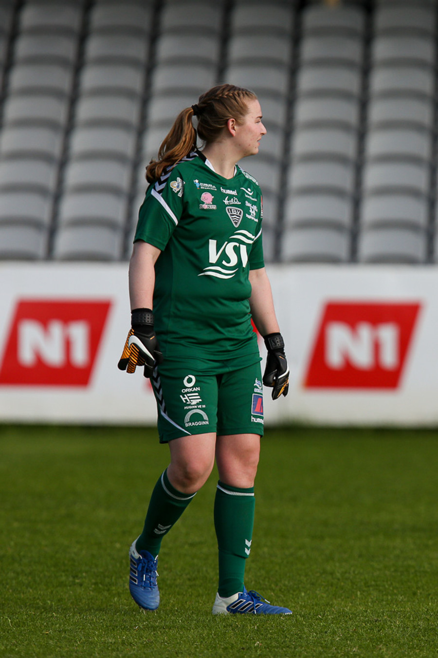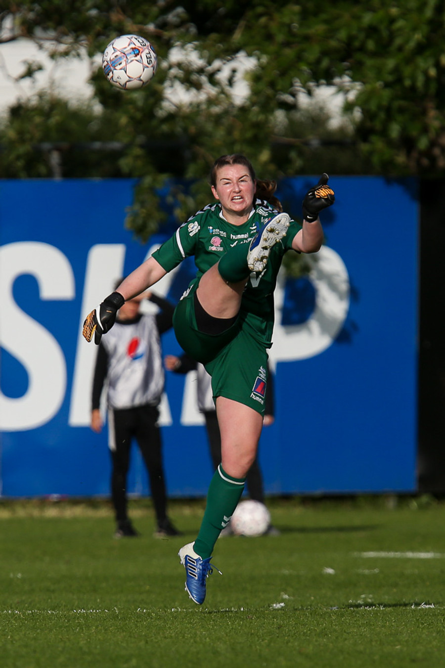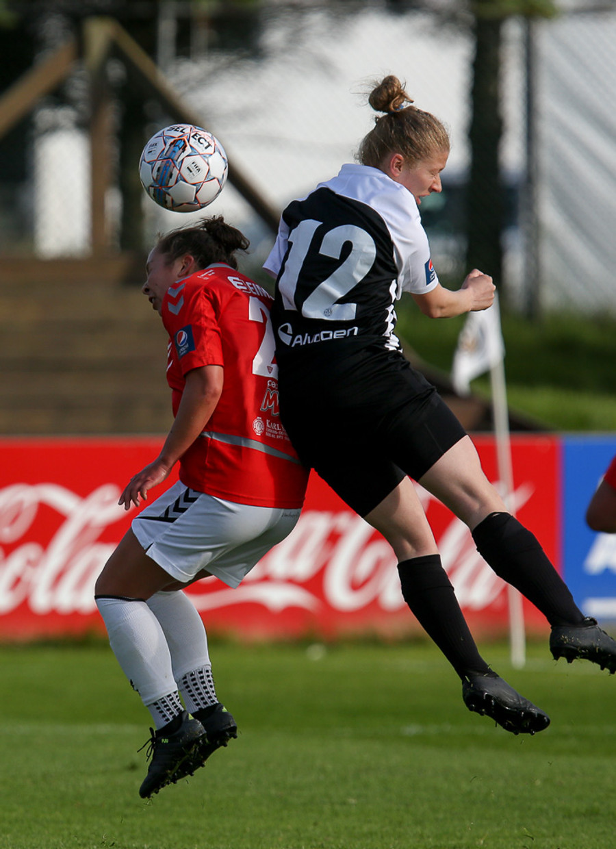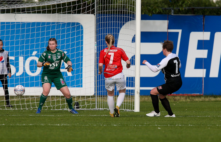 Hrafnhildur gerir mjög vel að koma langt útúr teignum og hreinsa boltann, en Klóe var komin í gegn og vantaði ekki mikið í að ná boltanum.