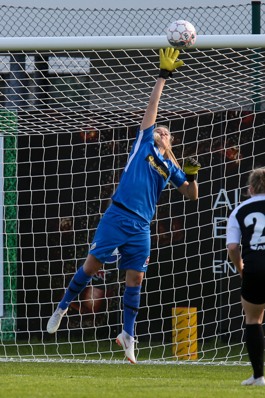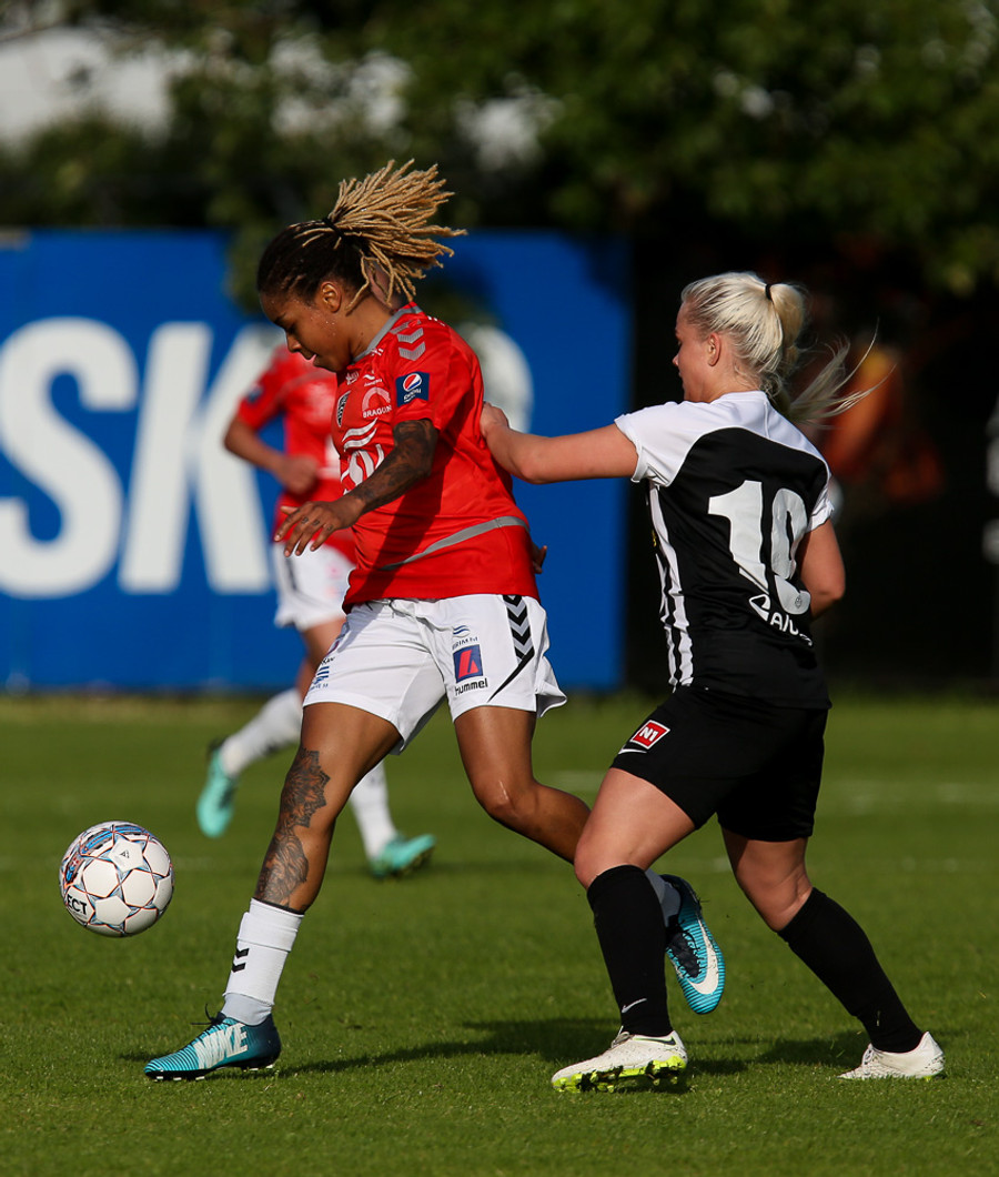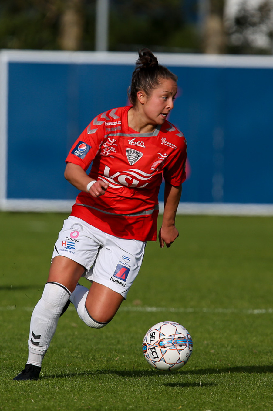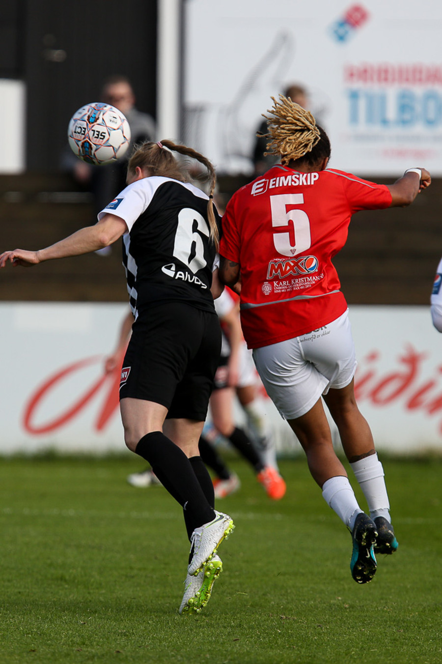 Hrafnhildur gerir mjög vel að koma langt útúr teignum og hreinsa boltann, en Klóe var komin í gegn og vantaði ekki mikið í að ná boltanum.