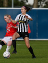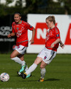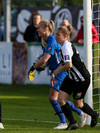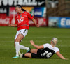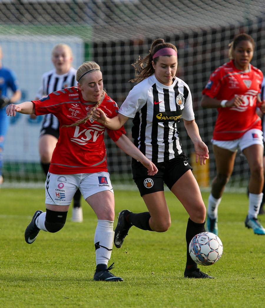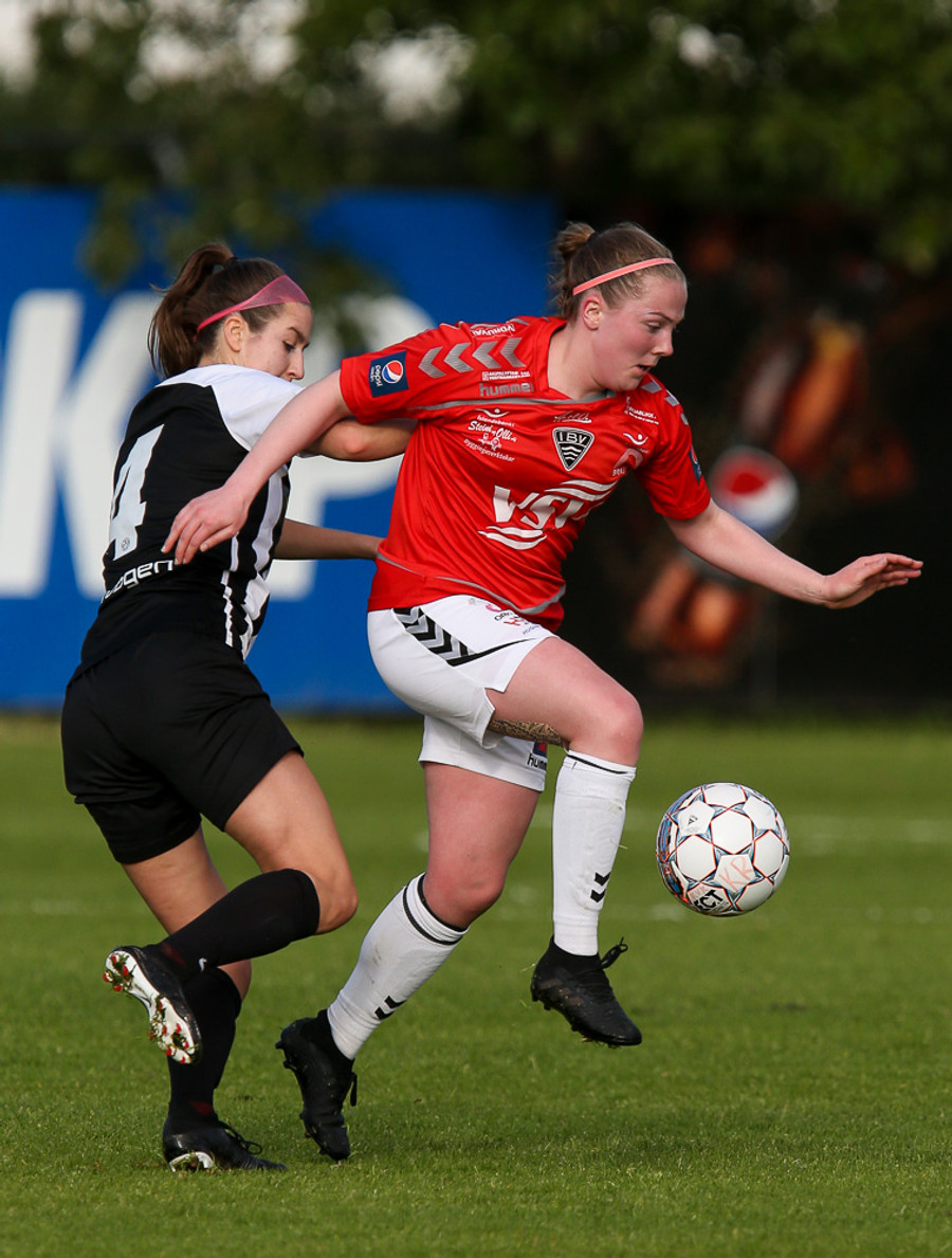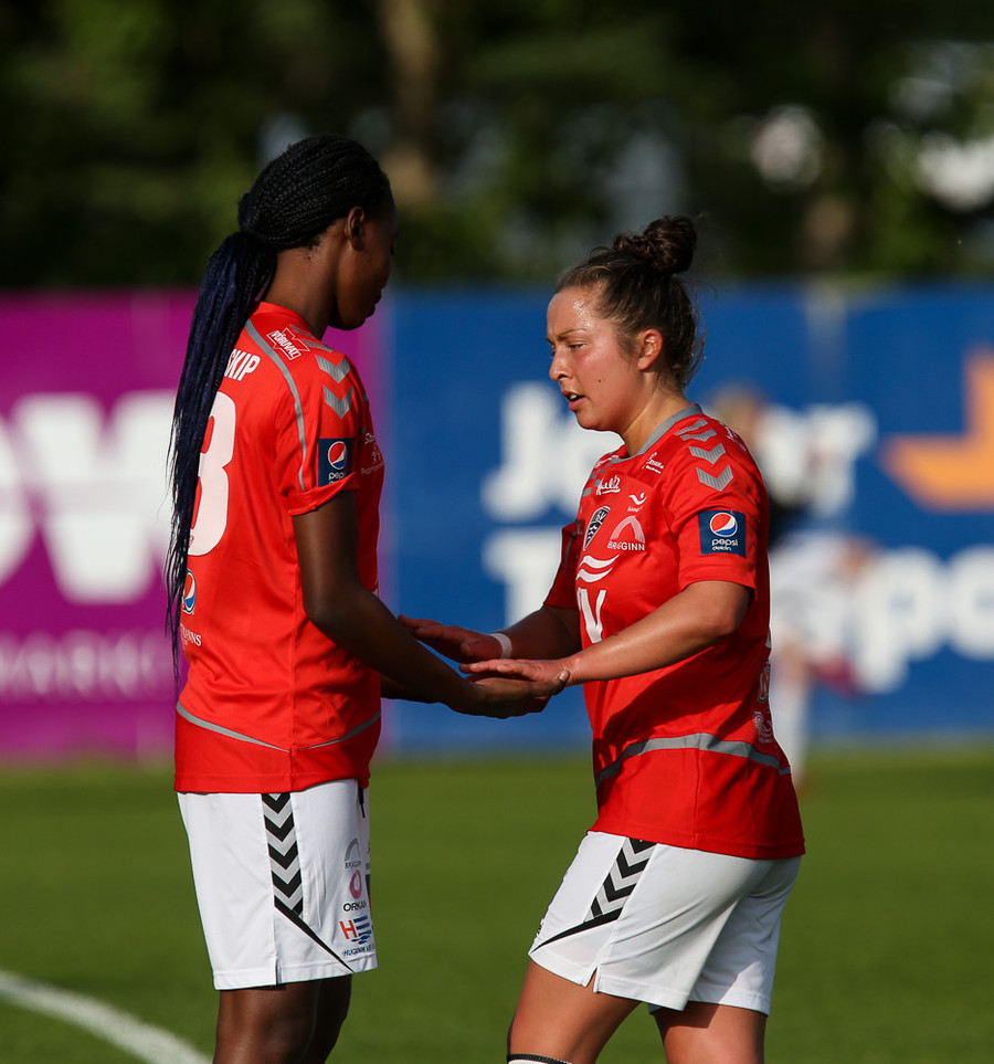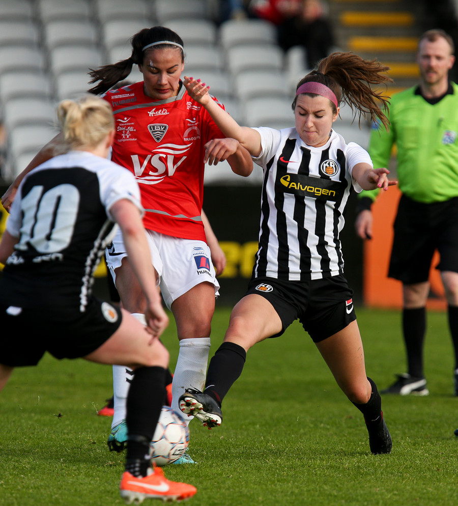 Hrafnhildur gerir mjög vel að koma langt útúr teignum og hreinsa boltann, en Klóe var komin í gegn og vantaði ekki mikið í að ná boltanum.