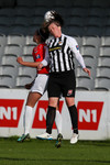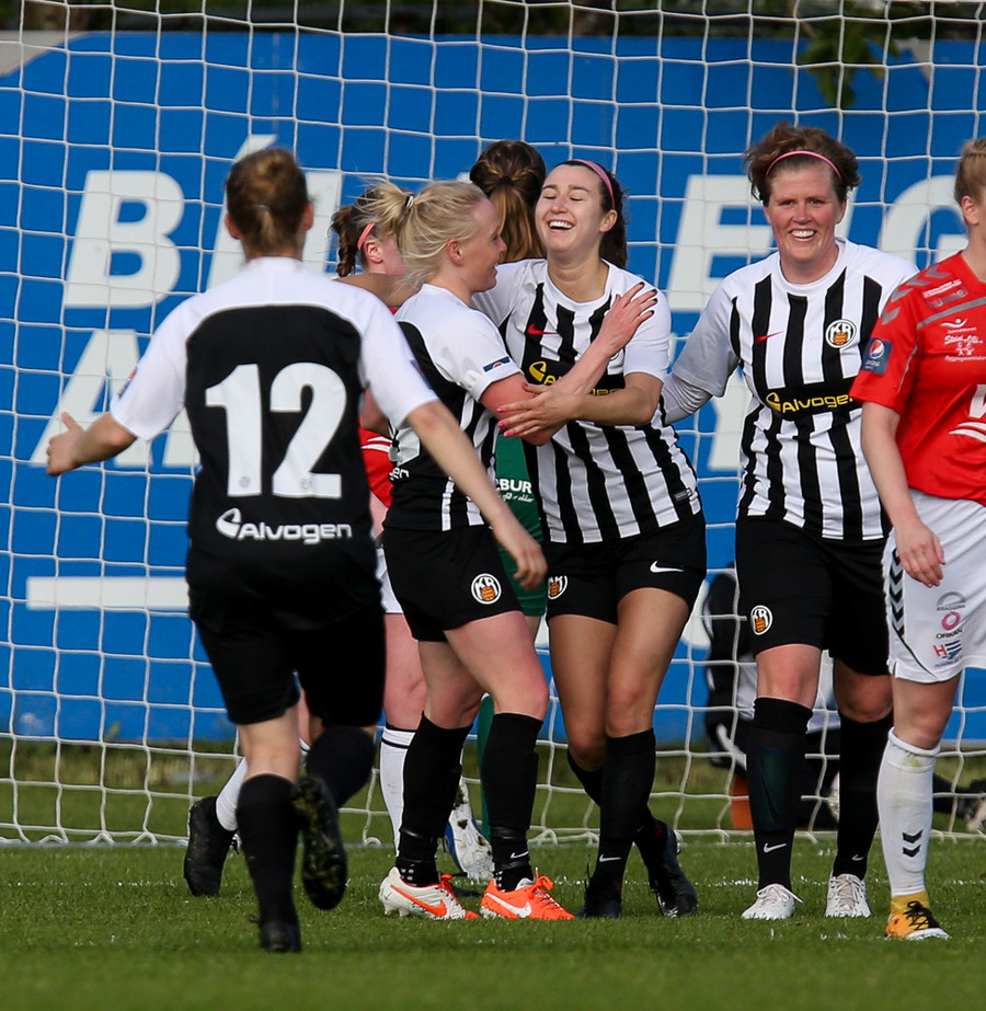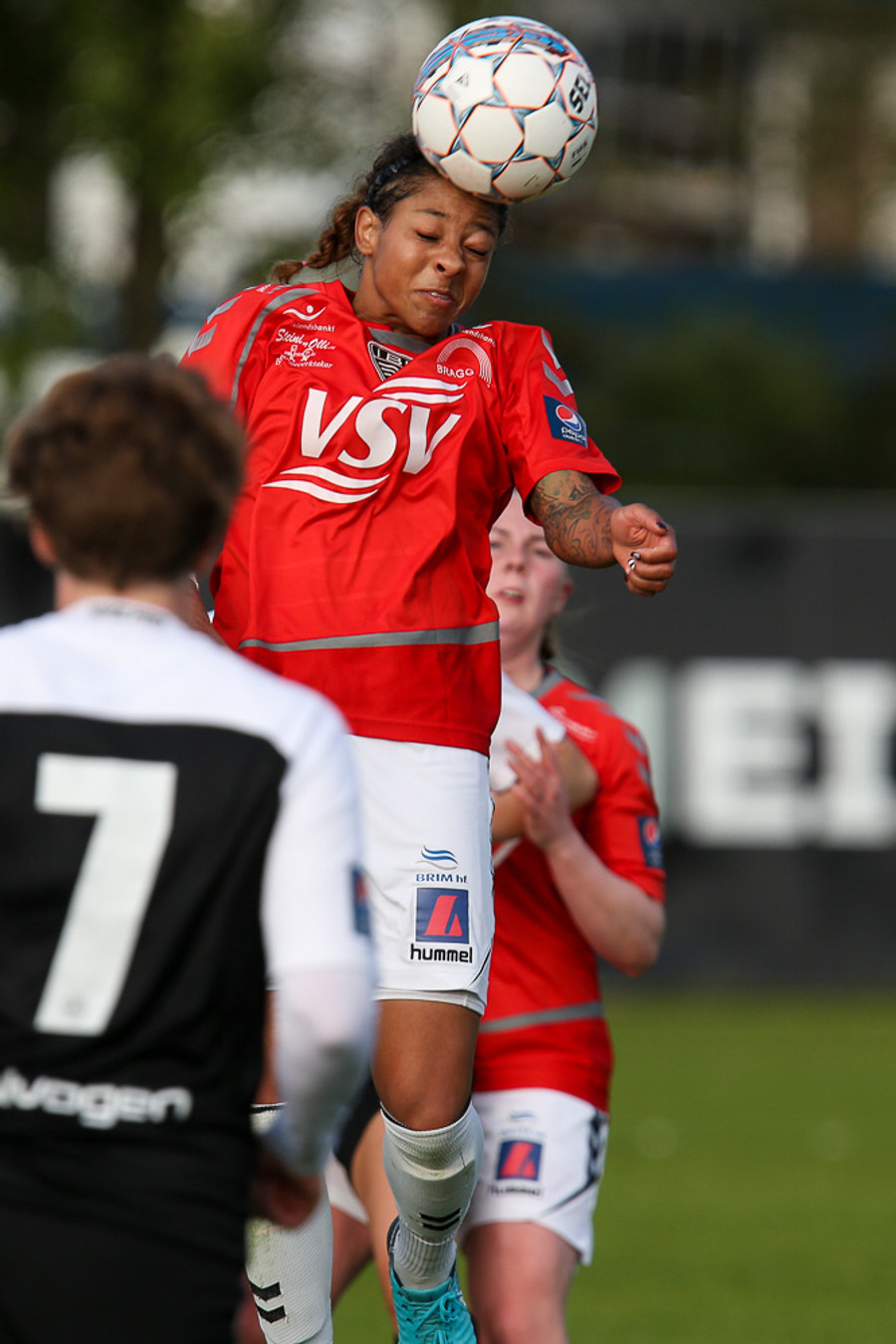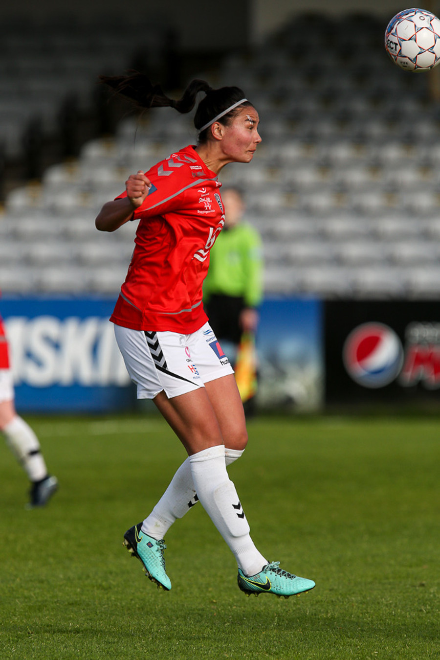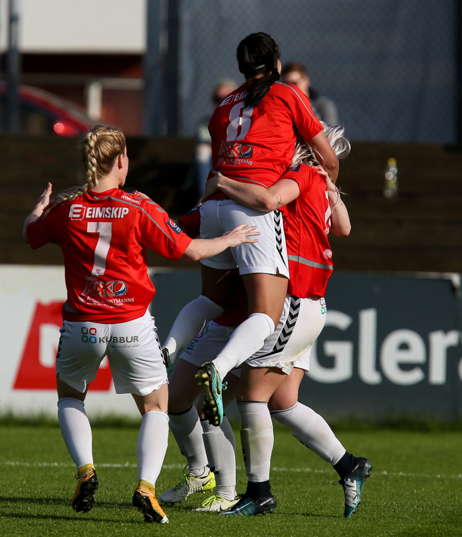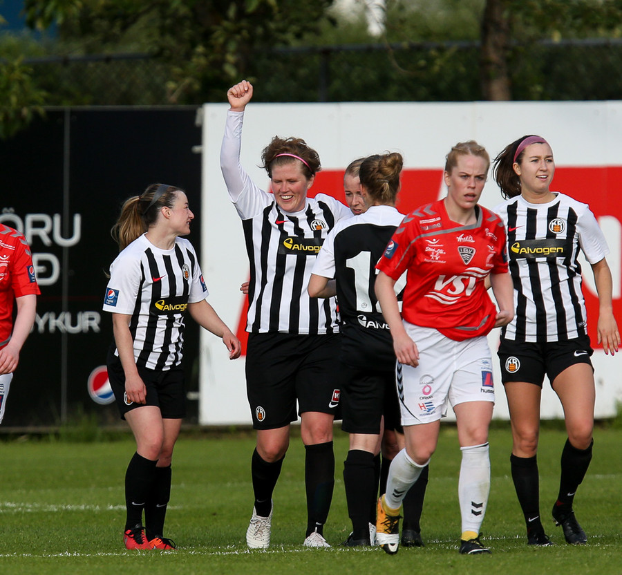 Hennar annað verk er að skalla fyrirgjöf Katie inn! ÍBV vann boltann á miðjunni og voru 4 á móti þremur varnarmönnum, skallinn í slánna og inn!
