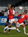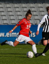 Shea vinnur boltann framarlega, snýr sér og reynir að vippa yfir Emily, boltinn laaaaaaaaak yfir slánna.