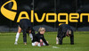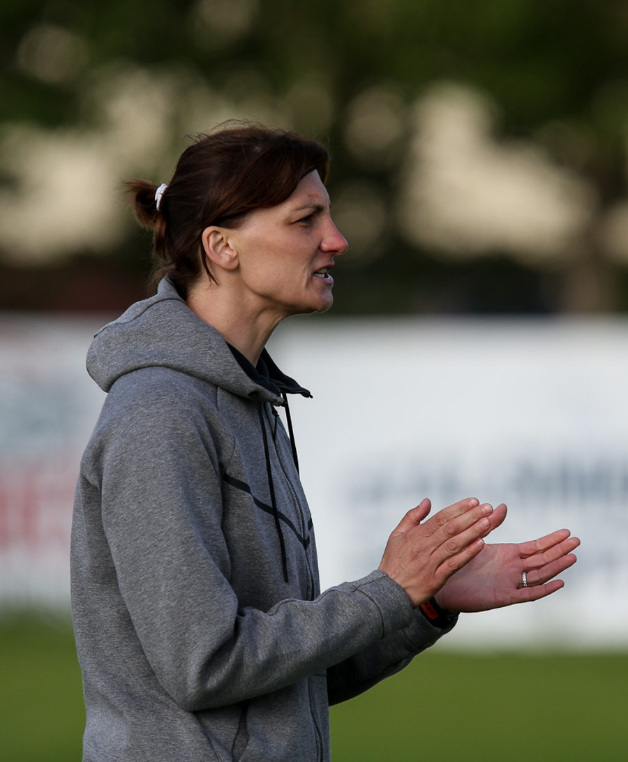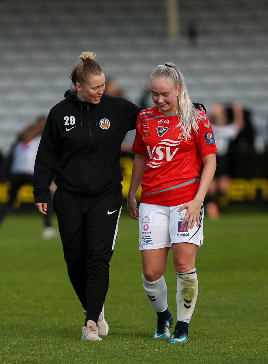 Sigríður er að fá aðhlynningu á meðan leikur heldur áfram, Jeff í klemmu, án miðjumanna á bekknum.