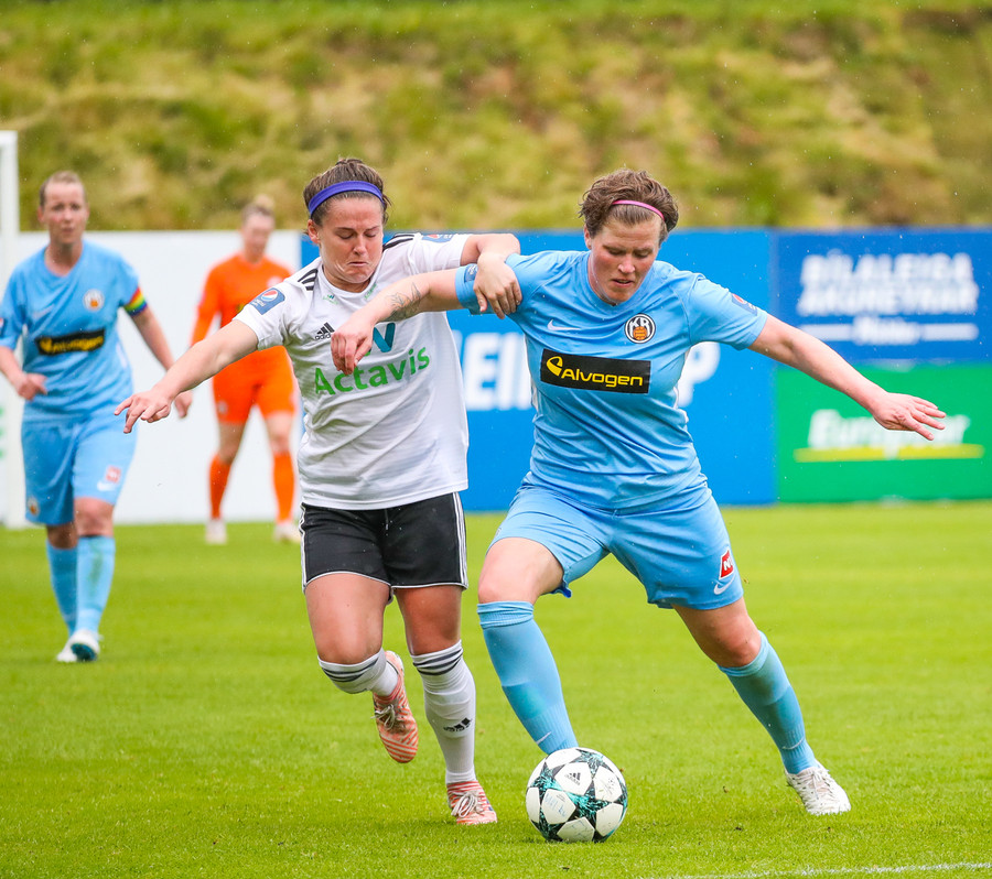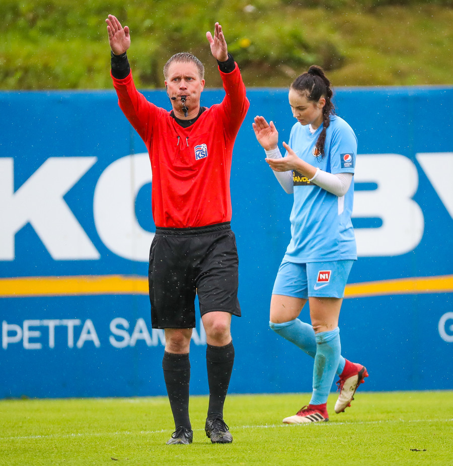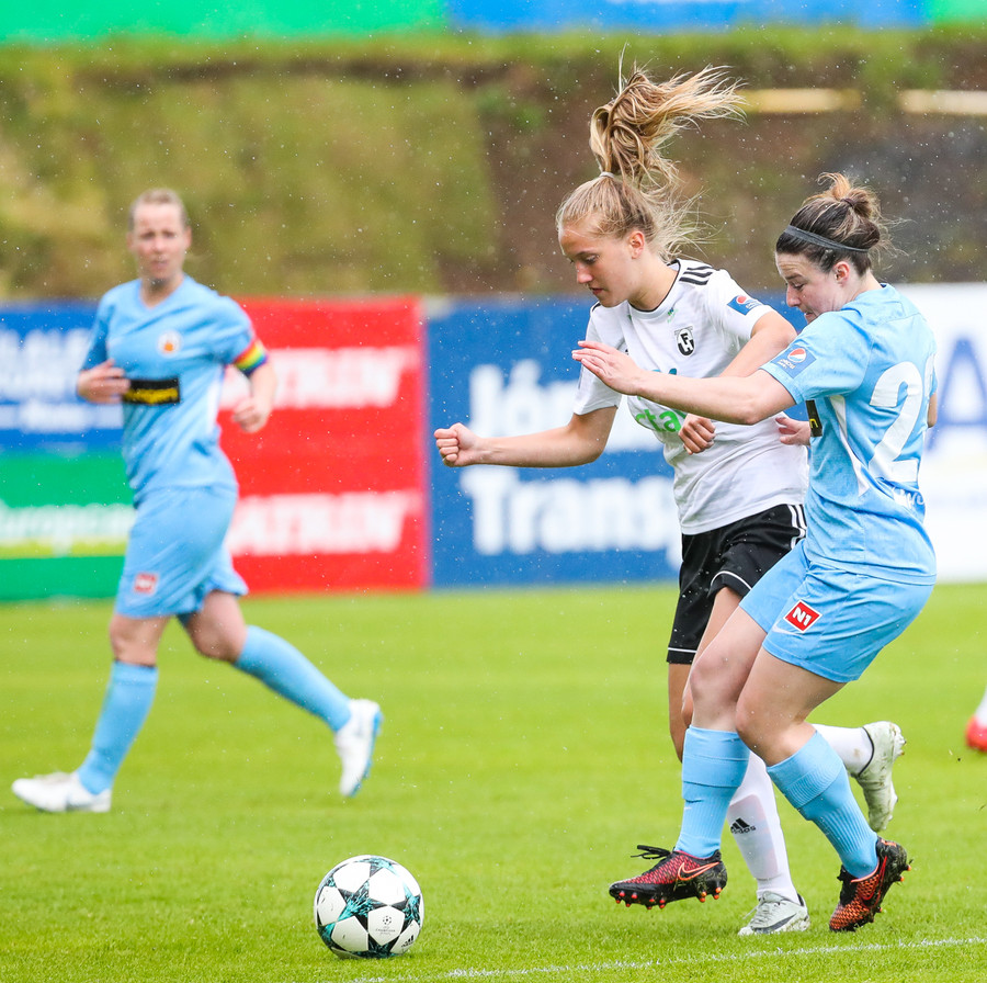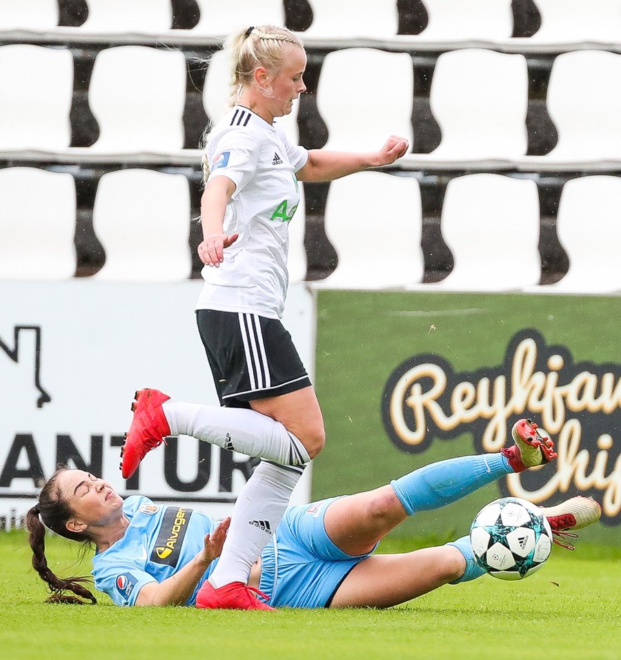 VÁÁ Þórey Björk er allt í einu kominn ein í gegn en Ingibjörg er með geggjað úthlaup og er á undan í boltann og hreinsar honum frá. Mér sýndist Þórey vera rangstæð en ekkert var dæmt.