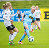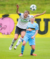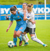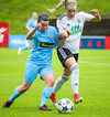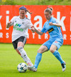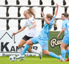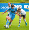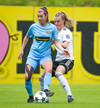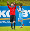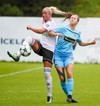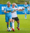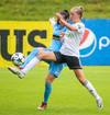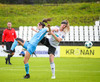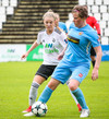 Guðný tekur hornið en Katrín Ómars skallar það frá og þetta rennur út í sandinn.