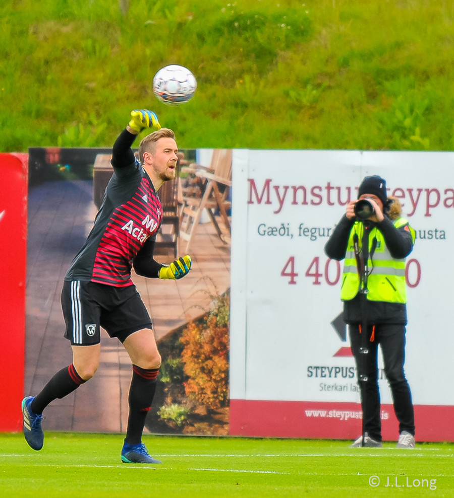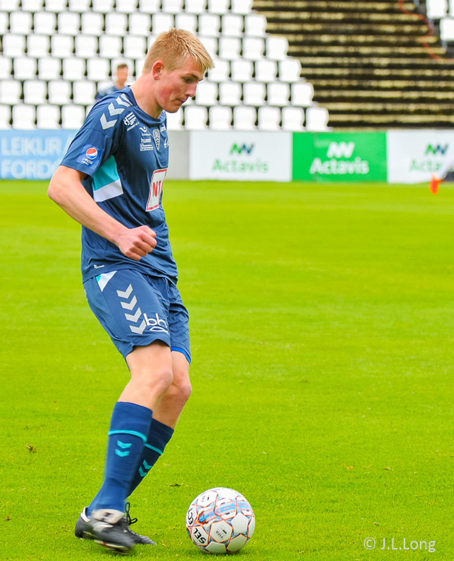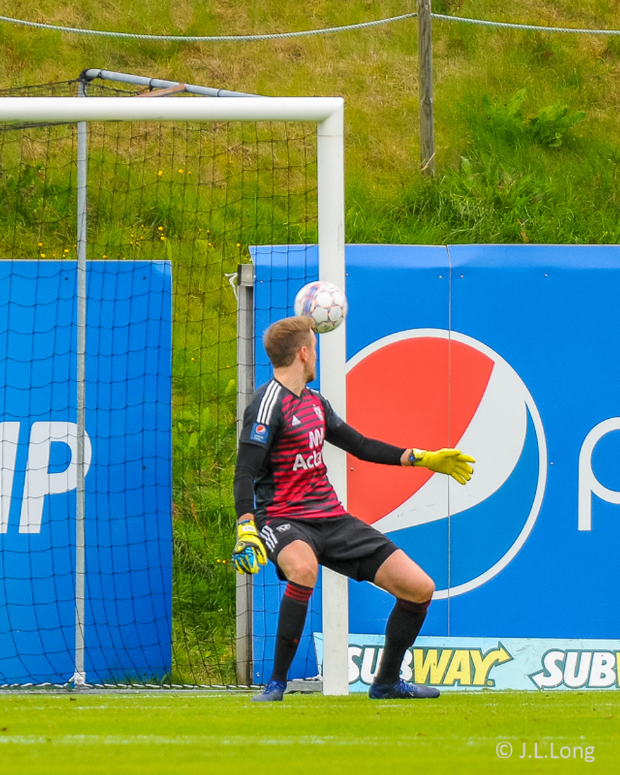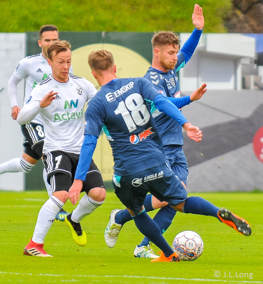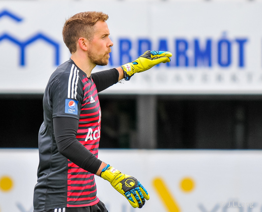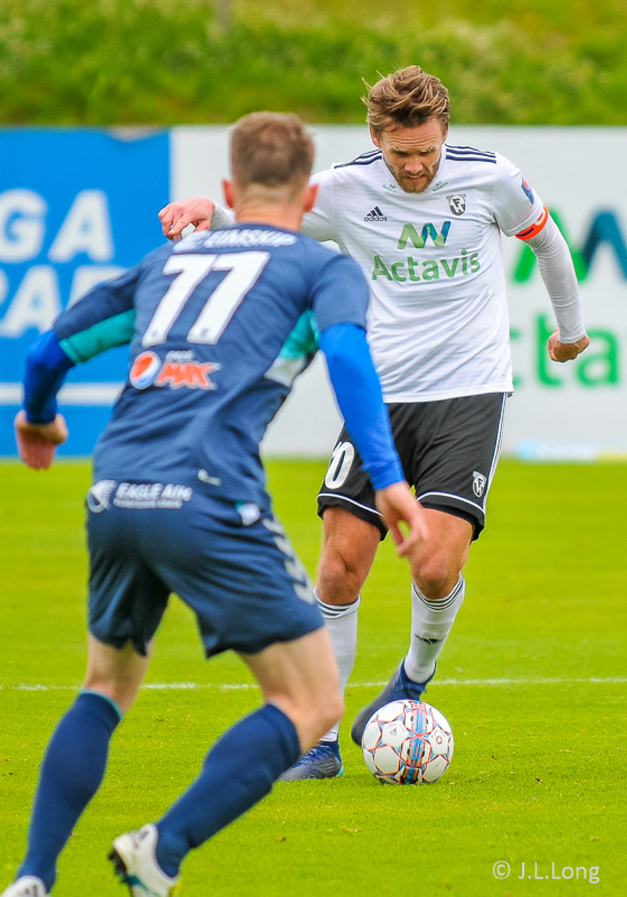 Jákup Thomsen með skot utan teigs beint á Halldór í markinu. Fín staða en skotið slakt.