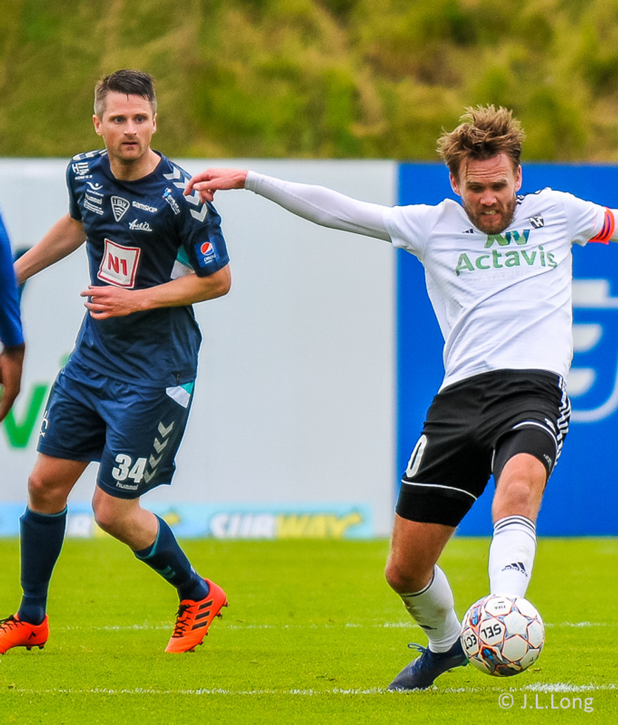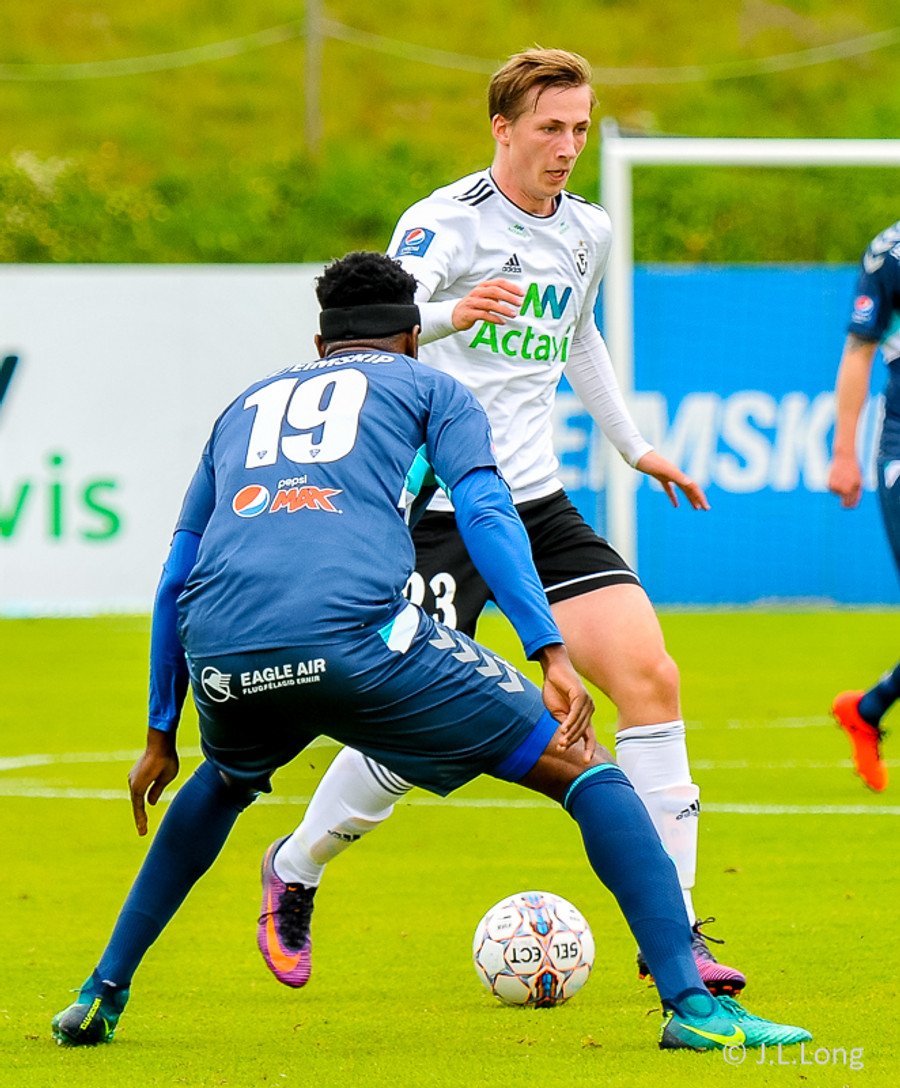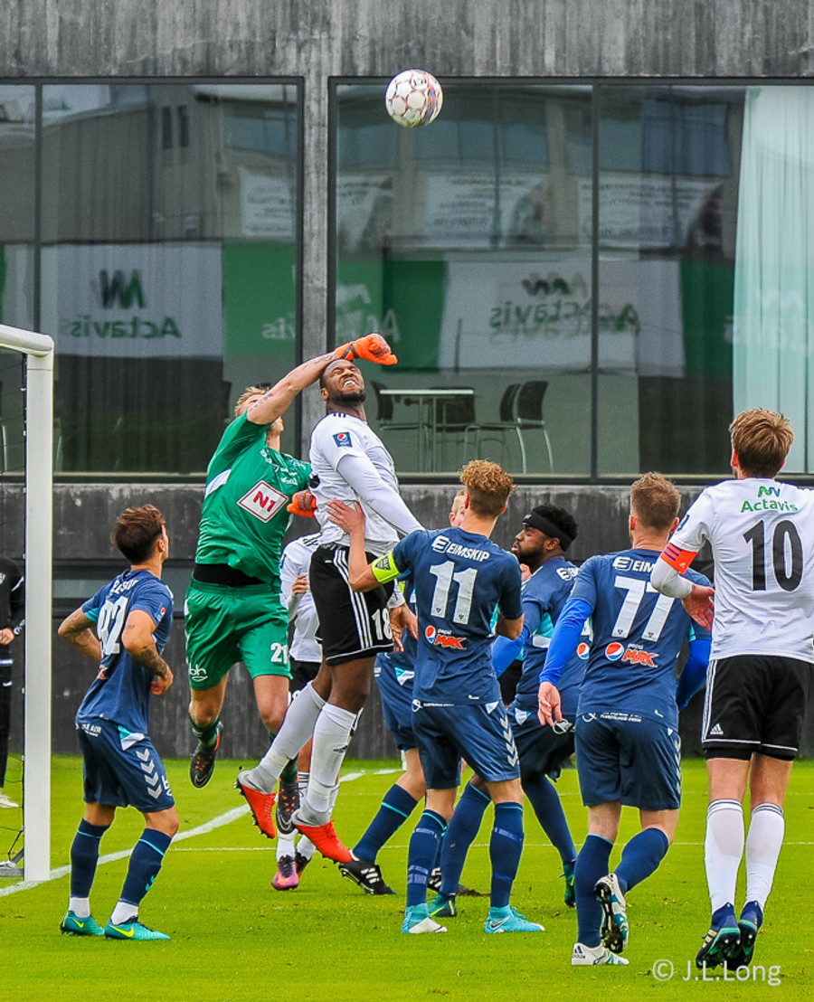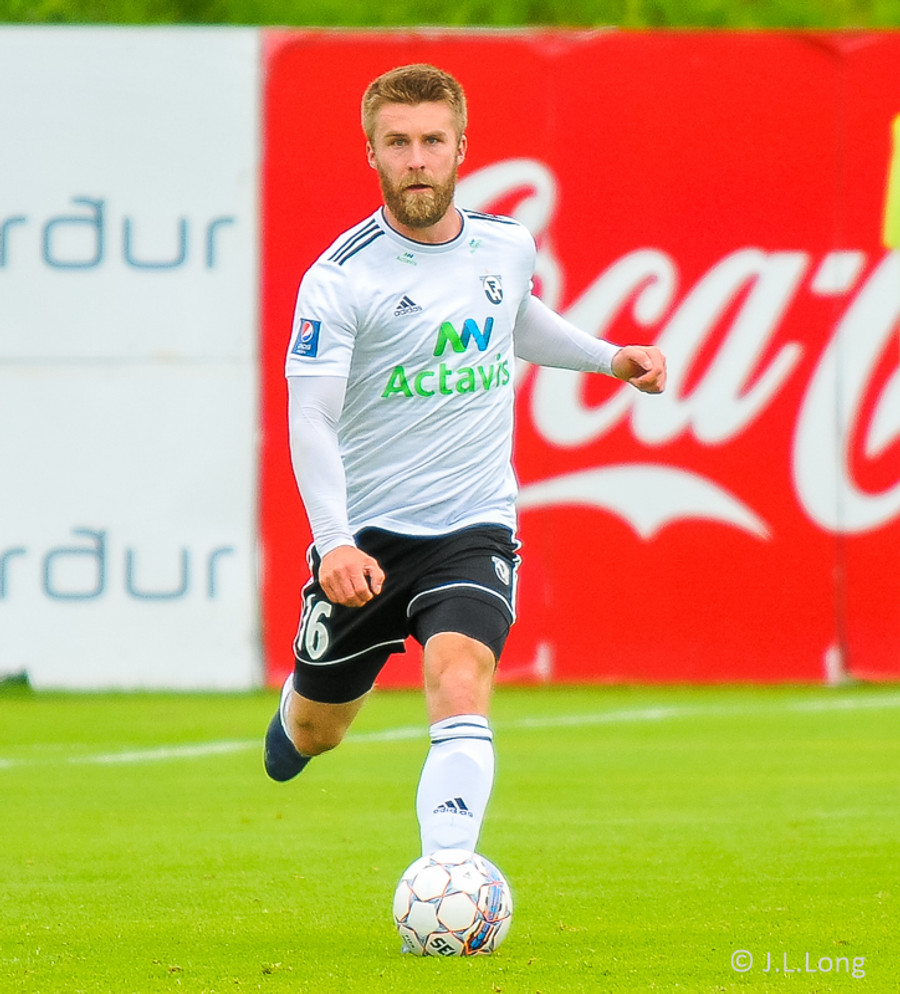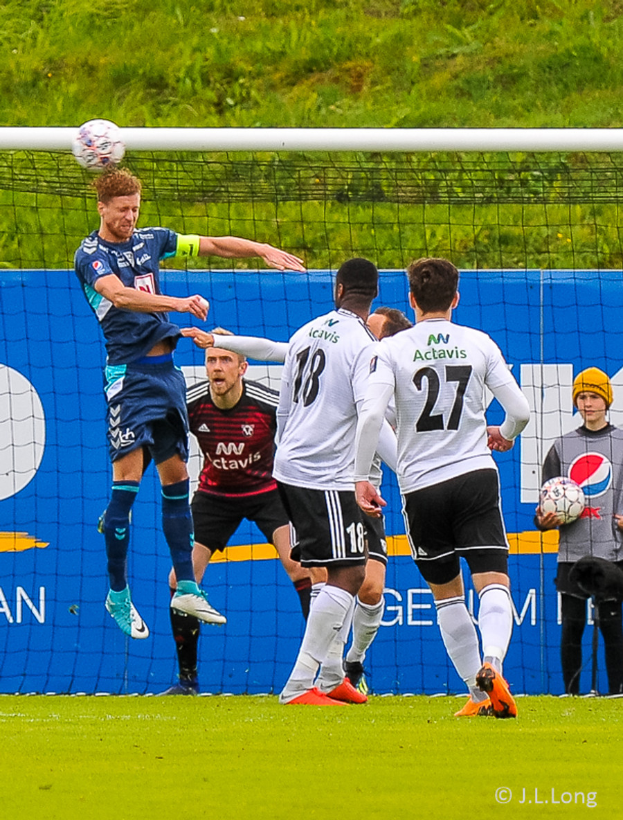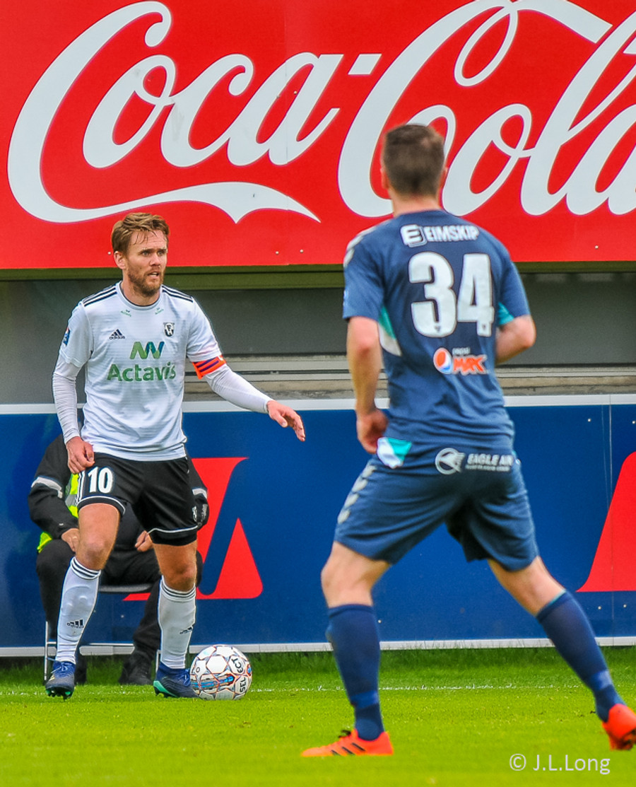 Jákup Thomsen með skot utan teigs beint á Halldór í markinu. Fín staða en skotið slakt.