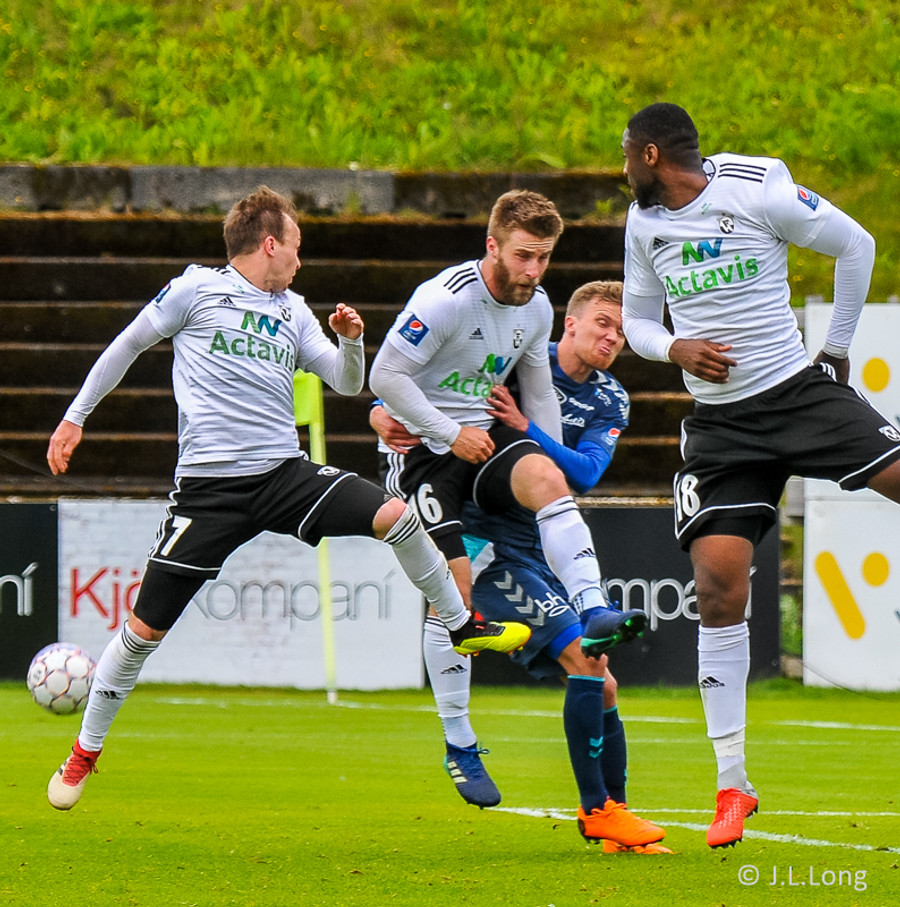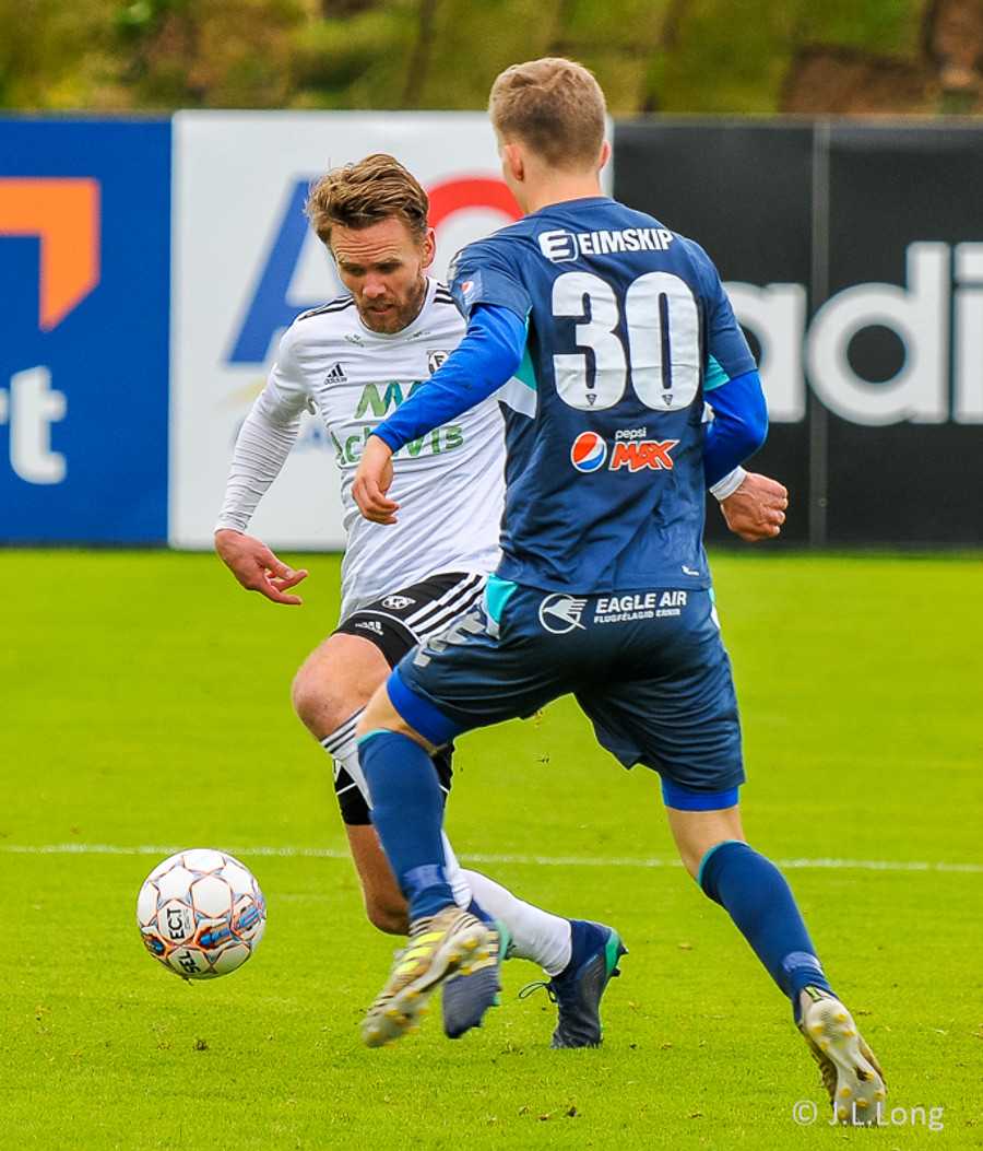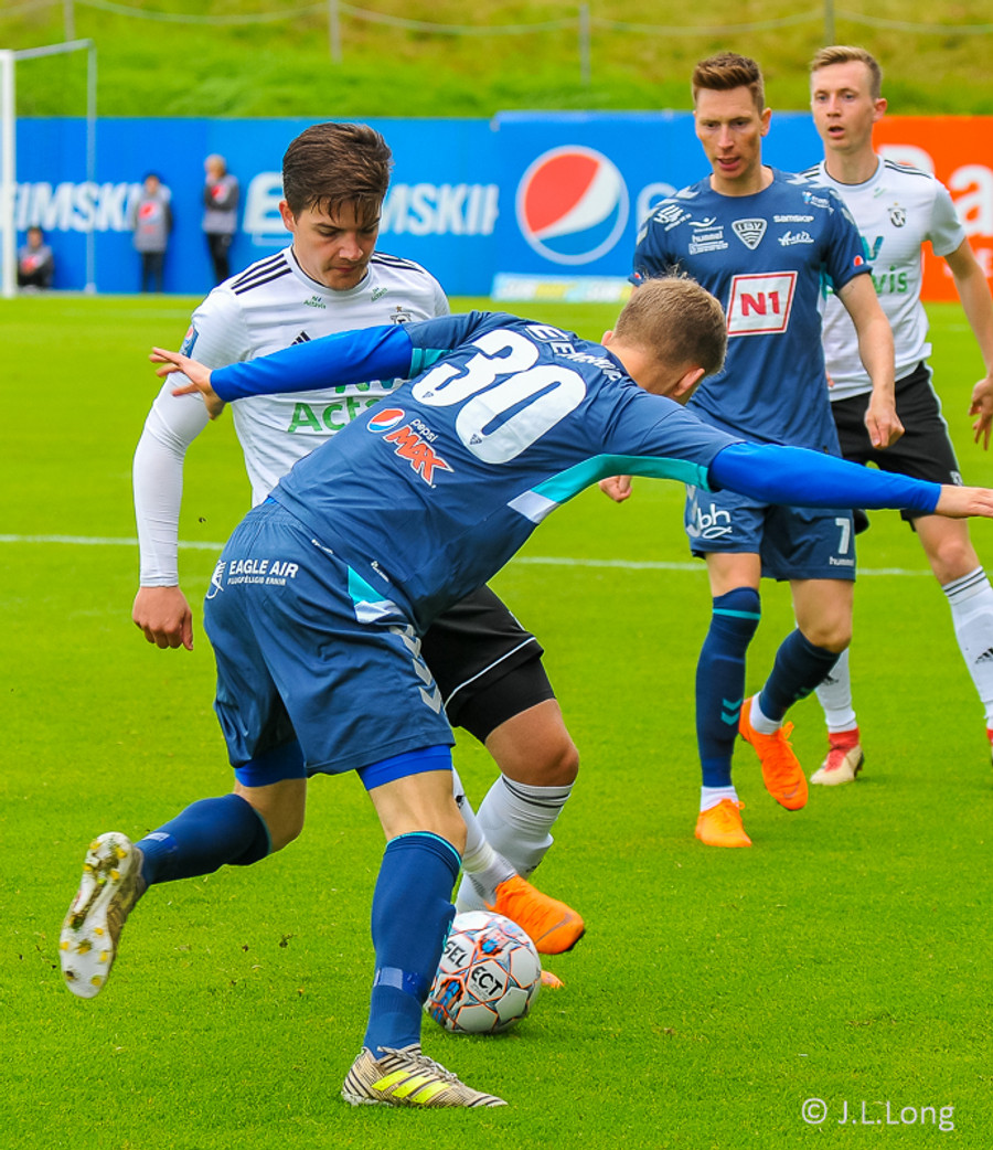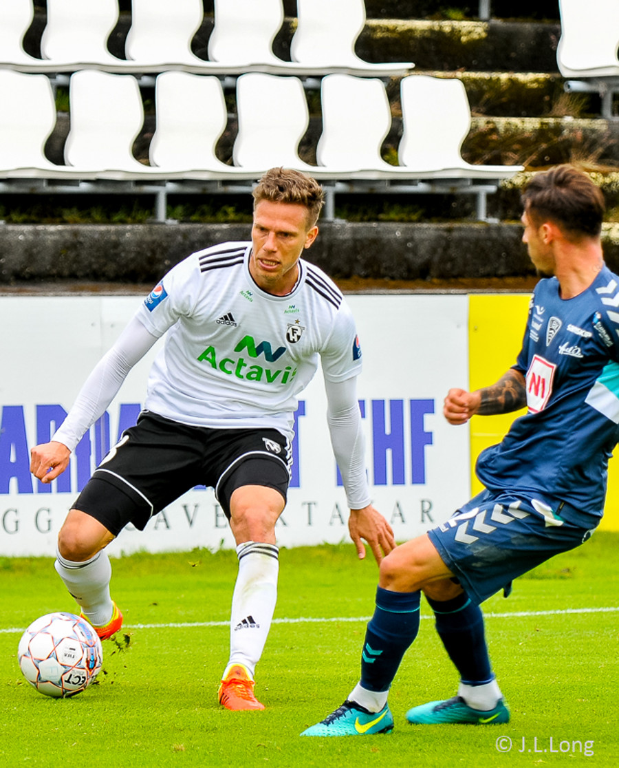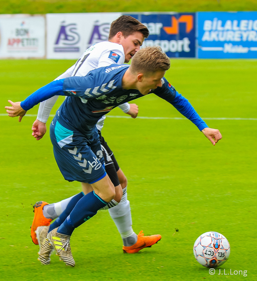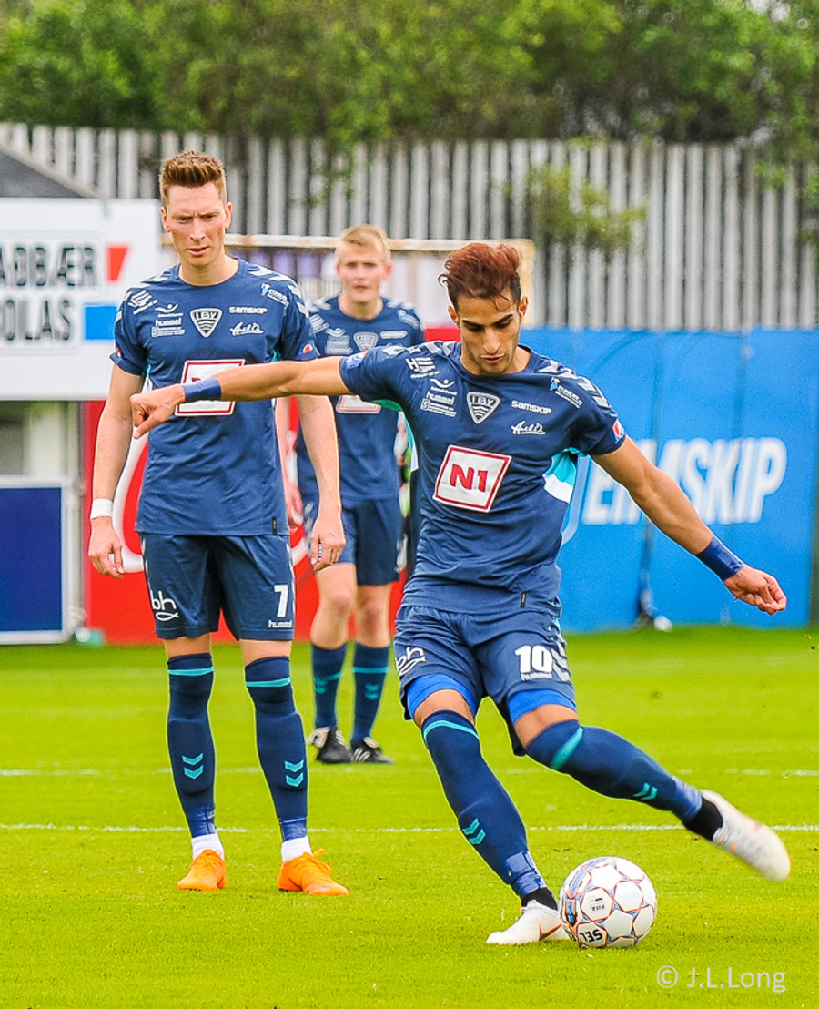 Jákup Thomsen með skot utan teigs beint á Halldór í markinu. Fín staða en skotið slakt.
