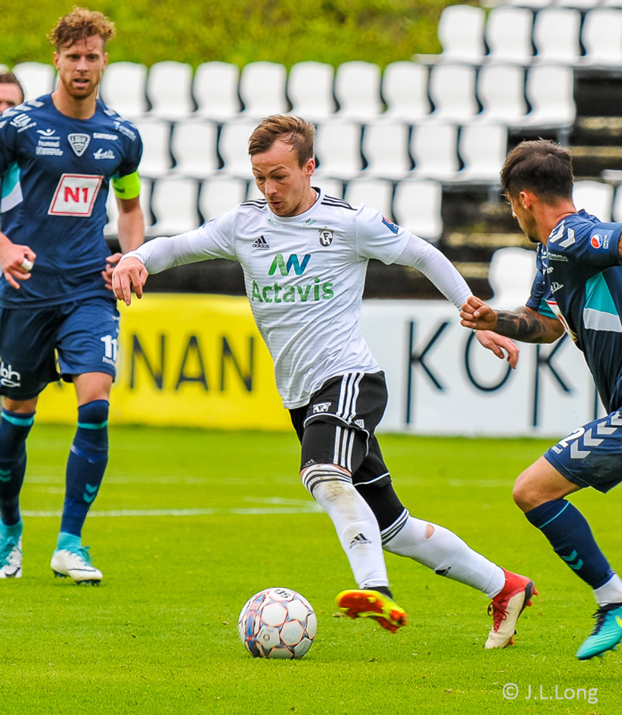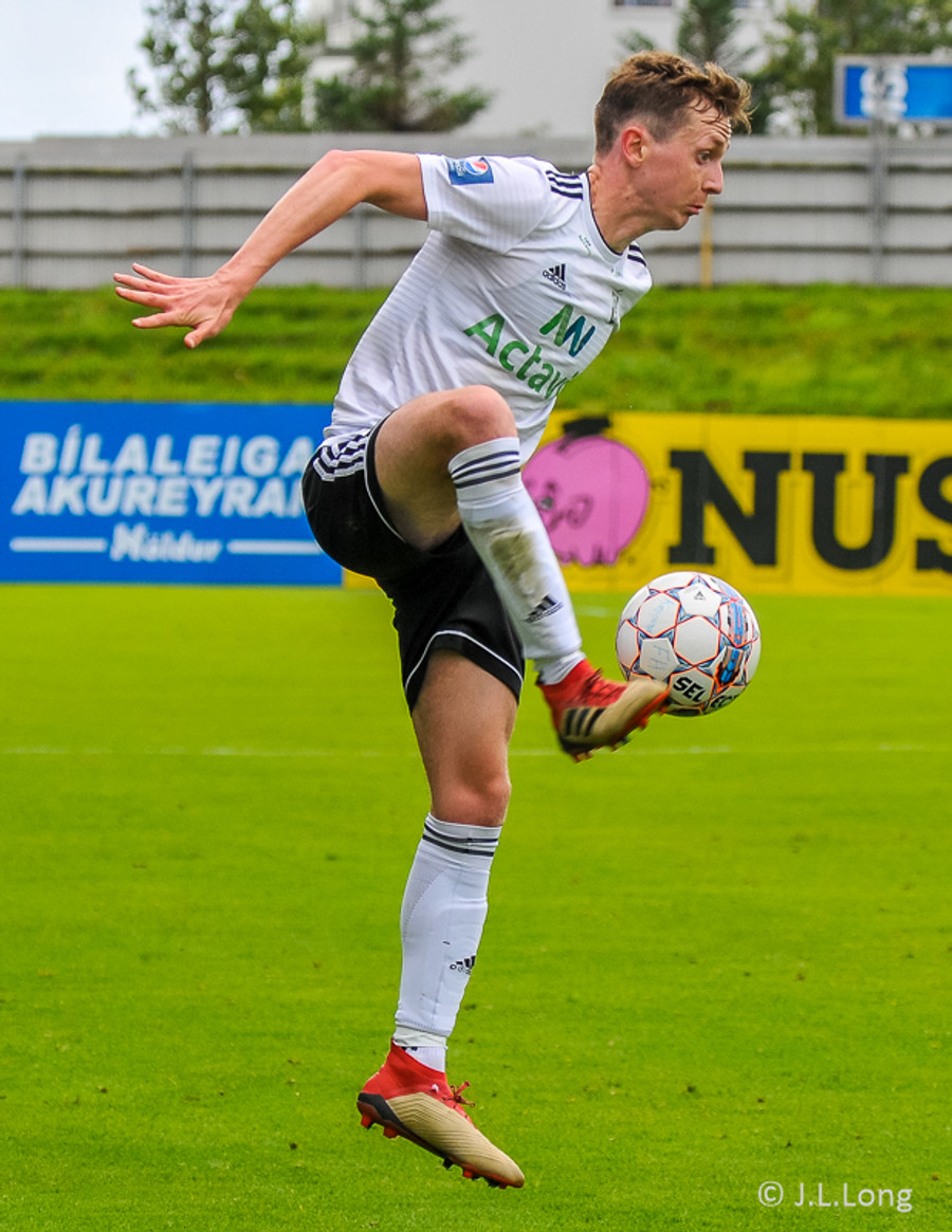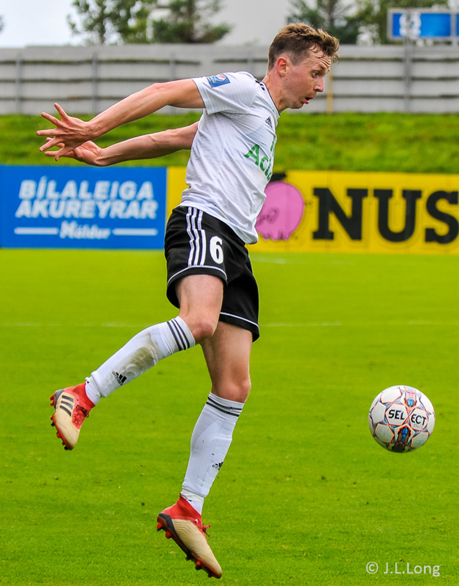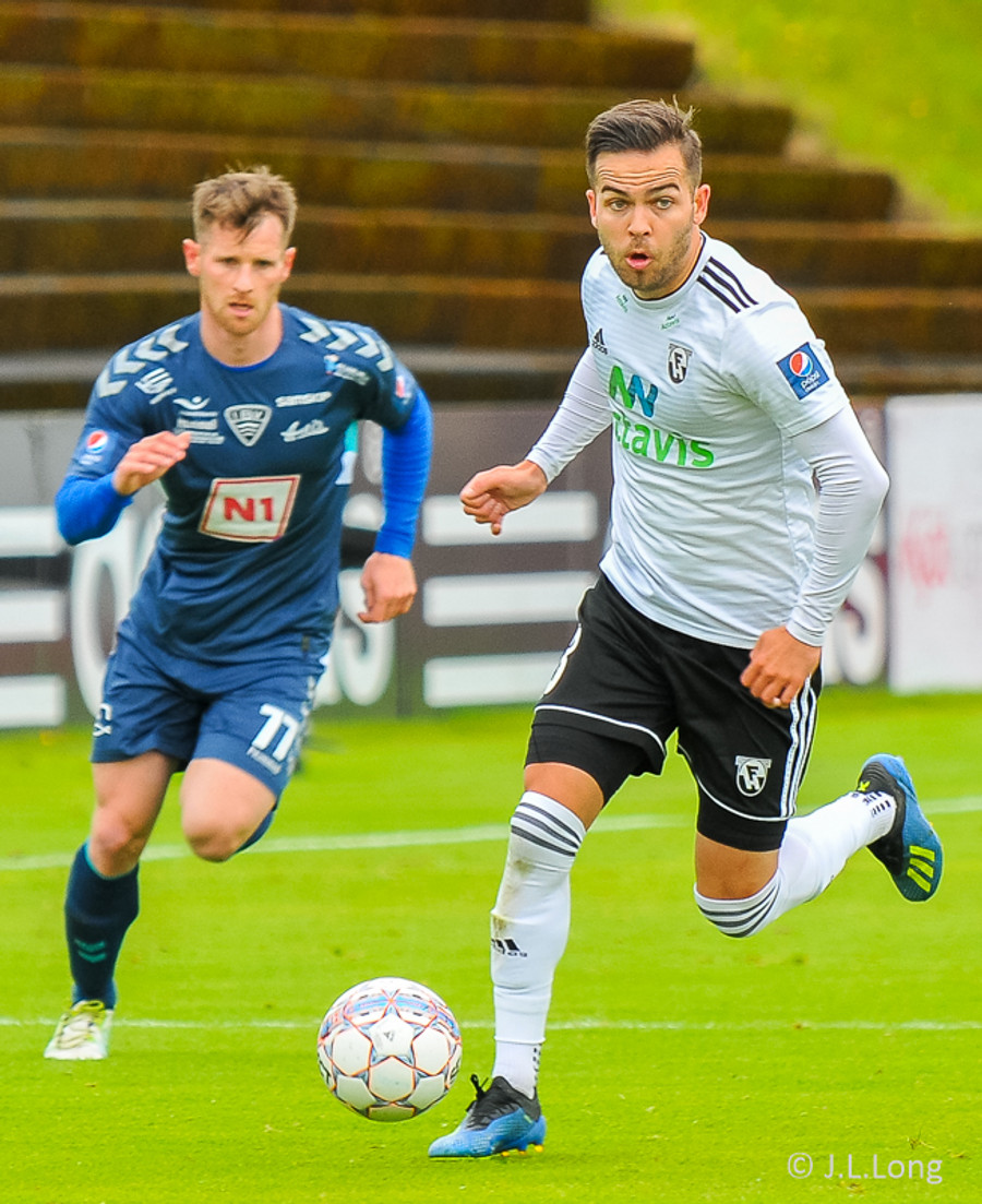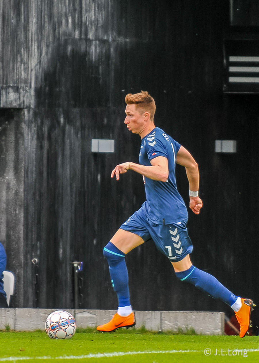 Jákup Thomsen með skot utan teigs beint á Halldór í markinu. Fín staða en skotið slakt.