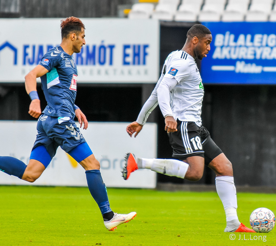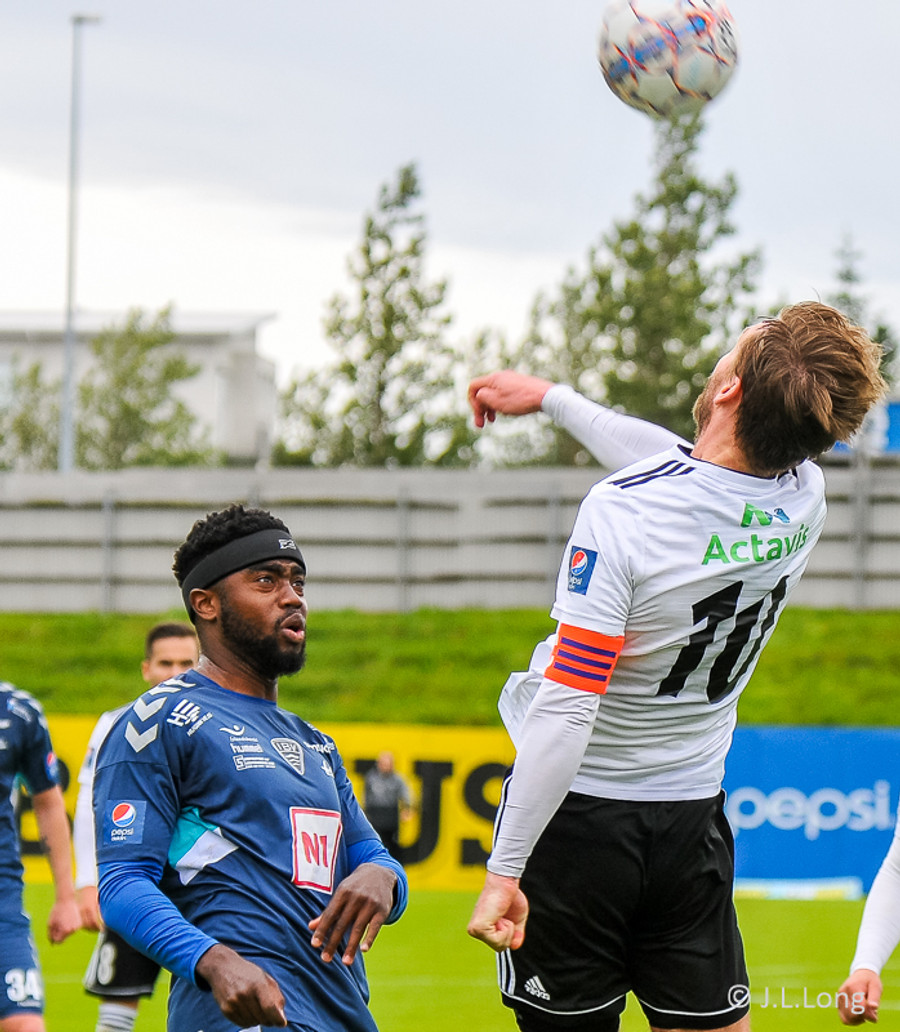 Kaj Leo með spyrnuna í gegnum allan pakkann, Shahab fellur innan teigs og vildi meina að þarna hafi verið bakhrinding. Hann og Davíð Þór lenda eitthvað saman í kjölfarinu og Ívar Orri dómari kallar þá til sín og róar þá aðeins niður. Áfram gakk.