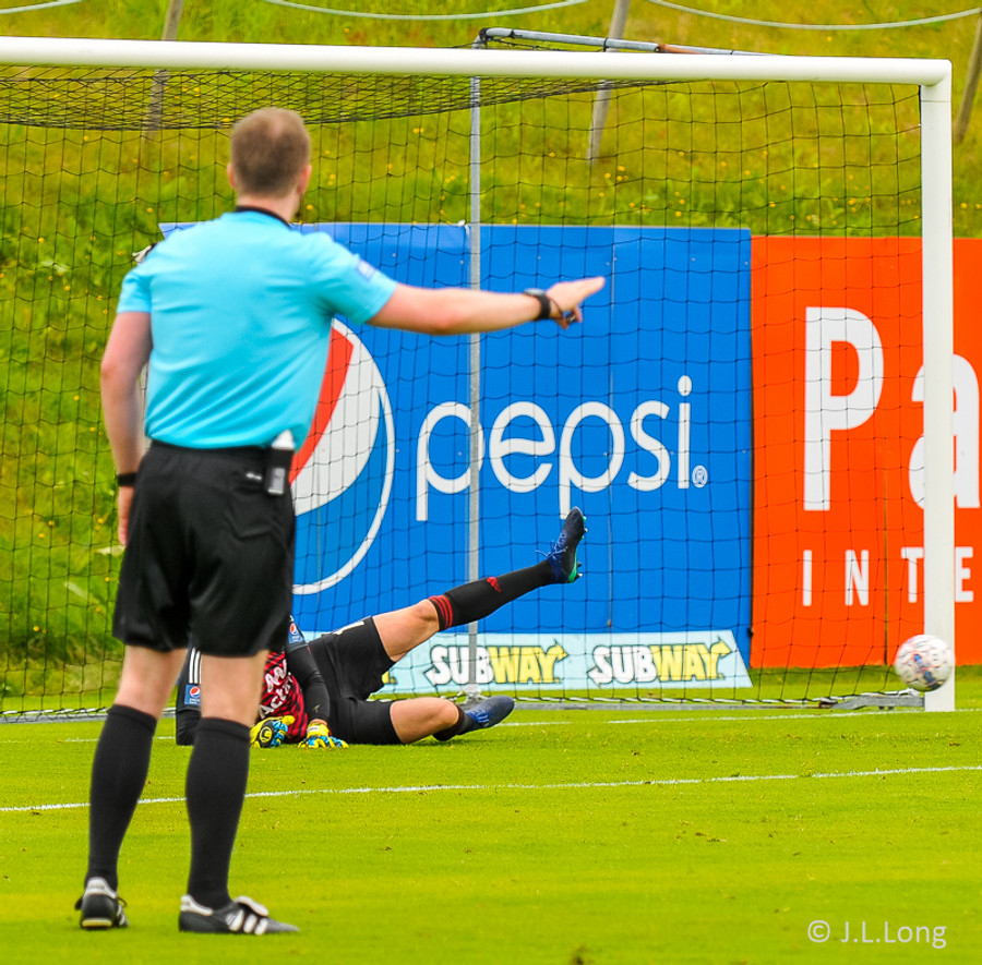 Jónatan átti sendingu fyrir á Atla Viðar, boltinn fór í Diogo á leiðinni og vildi Jónatan meina að boltinn hafi farið í hendina á Diogo. Hann lét amk. aðstoðardómarann heyra það eftir að Atli Viðar klúðraði.