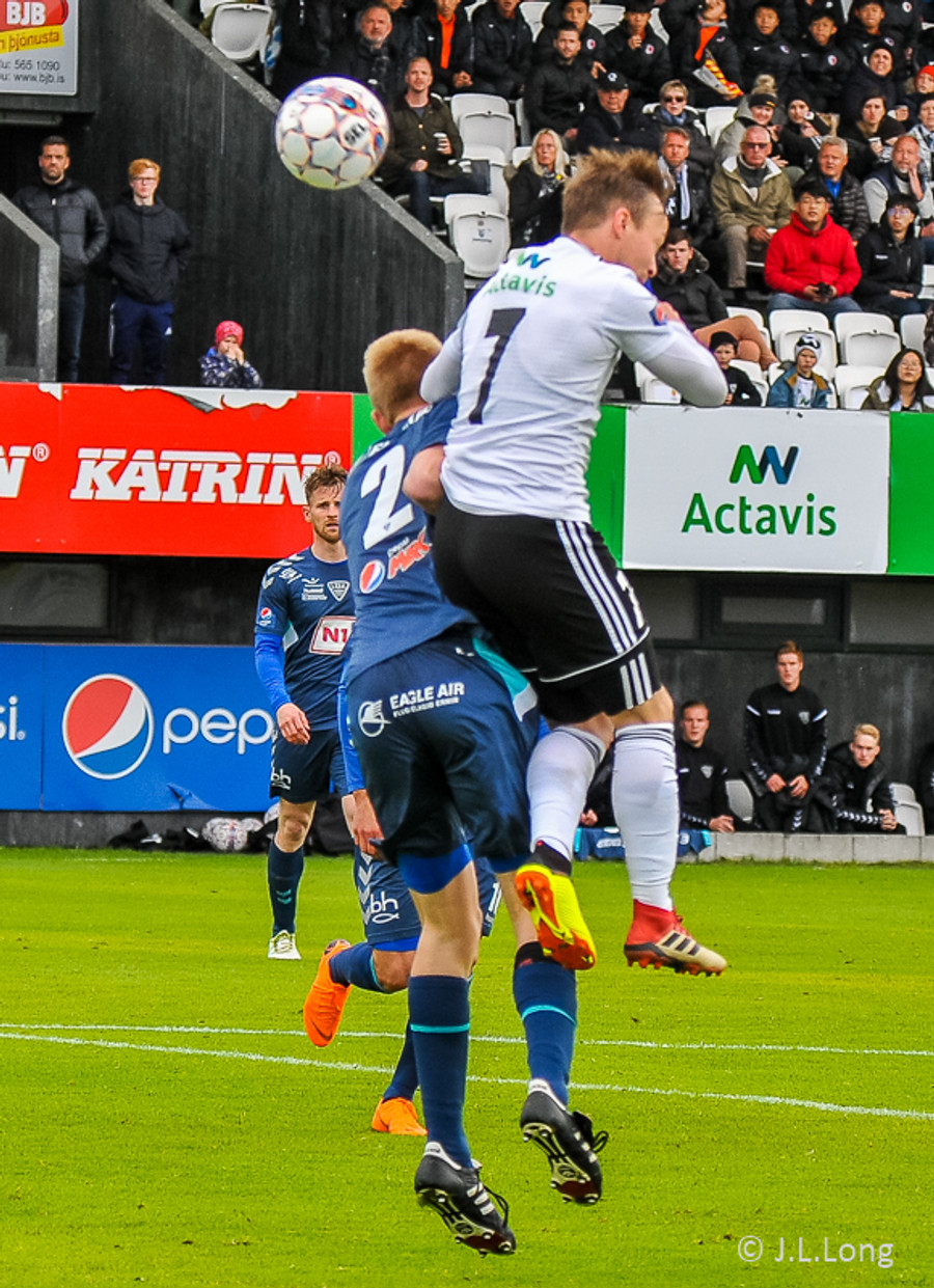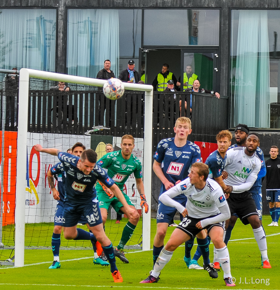 Hjörtur Logi með viðstöðulaust skot utan teigs eftir að Halldór Páll hafði kýlt hornspyrnu Brands út fyrir teiginn.